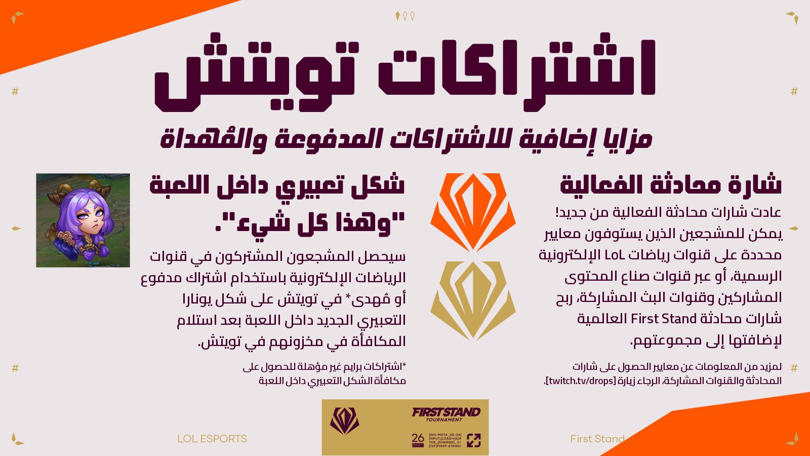سيتمتع كل مشتركي تويتش في قنوات رياضات LoL الإلكترونية المشارِكة* في أثناء بطولة First Stand بمزايا، مثل أشكال المحادثة التعبيرية المخصصة والشارات ومشاهدة خالية من الإعلانات. ستخصص Riot حصة من العوائد المكتسبة لصندوق الإيرادات العالمي الذي يدعم الدوريات والفِرق في منظومة رياضات LoL الإلكترونية بشكل مباشر.