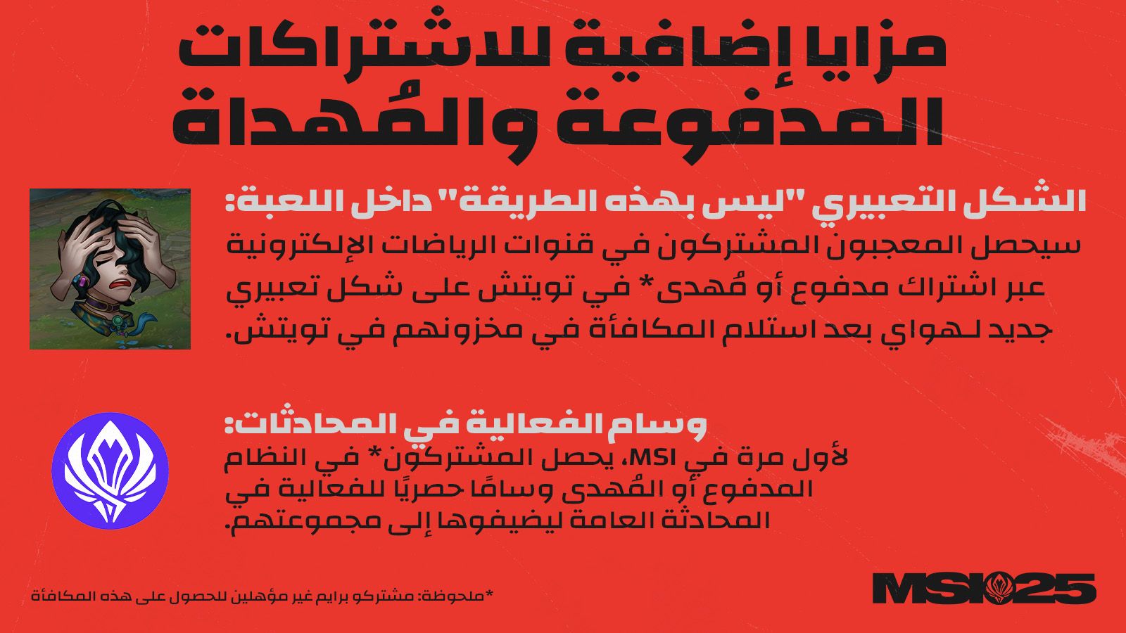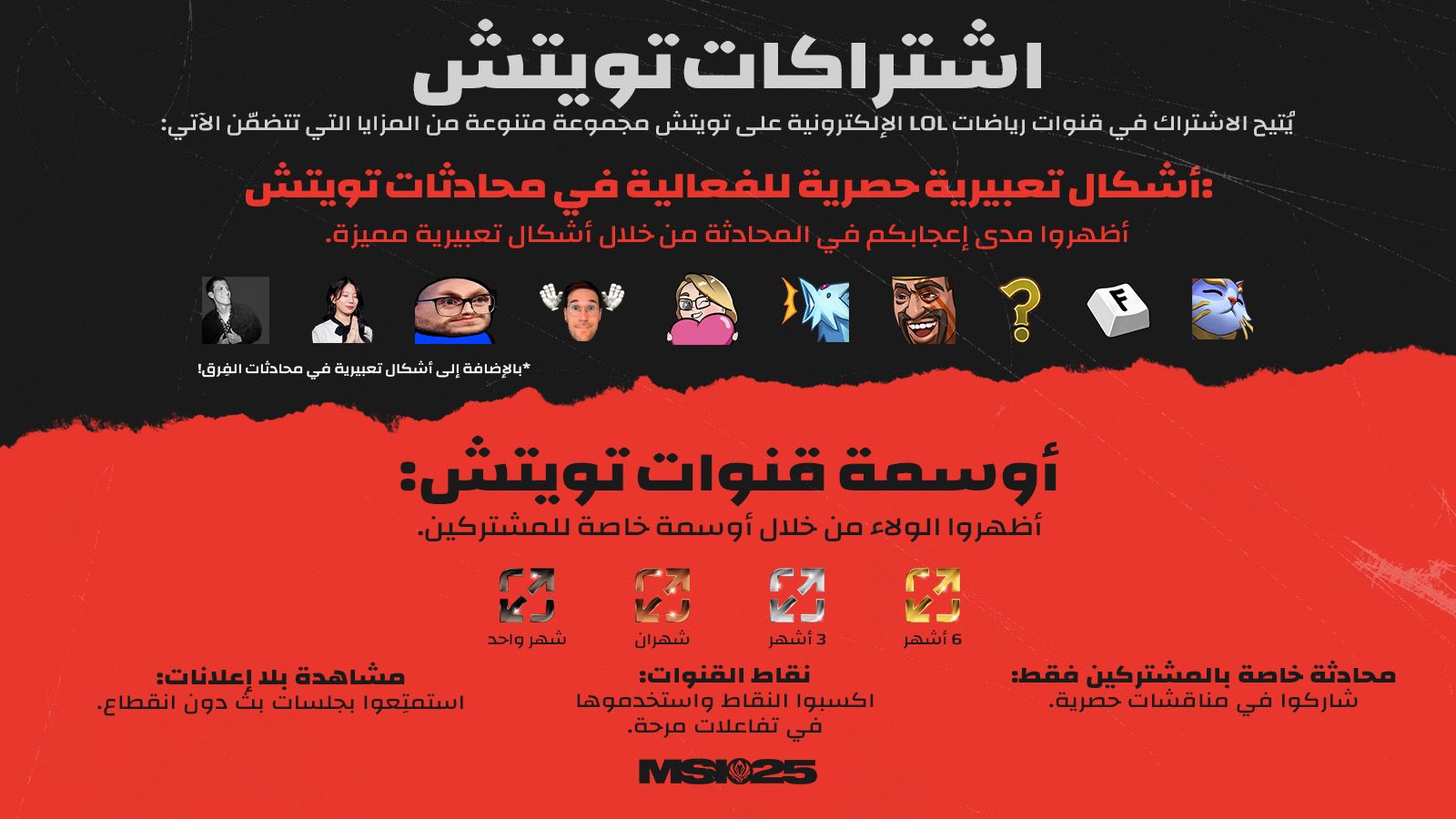 لقد عادت اشتراكات تويتش إلى بطولة MSI. يتمتع كل مشتركي تويتش في قنوات رياضات LoL الإلكترونية بمزايا مثل الأشكال التعبيرية المخصصة في المحادثات والأوسمة والمشاهدة بلا إعلانات والتقدير خلال جلسات البث المباشر. للتذكير، ستخصص Riot حصة من العائدات المكتسبة لصندوق الإيرادات العالمي الذي يدعم الدوريات والفِرق في منظومة رياضات LoL الإلكترونية بشكل مباشر.