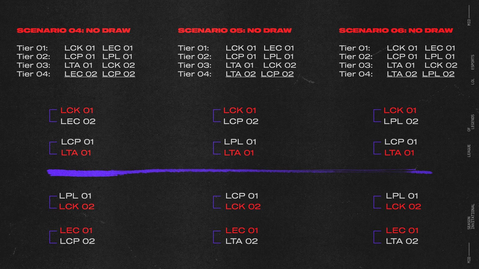 يلزم قرعة لوضع فريق من المستوى 4؛ ويعني ذلك الفريق الذي تقع عليه القرعة سيواجه LCK1. وانطلاقًا من ذلك القرار، تتوالى كل المواجهات الأخرى تلقائيًا وفقًا للقواعد لتجنب احتمالية مواجهات من المنطقة نفسها في الجولة الثانية. على سبيل المثال: