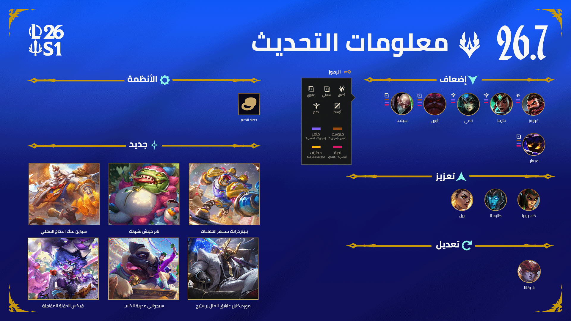 ستكون موازنة اللعبة هذا التحديث على نطاقٍ أصغر، بما أننا نركز بشكل متزايد على تحديث الموسم الثاني الشهر المقبل. لدينا بعض التعديلات على مجموعة أبطال الدعم، حيث تهيمن نامي وكارما على الدعم في مستويات المهارة العليا بينما اختفت ريل تقريبًا. وبخلاف ذلك، ستكون إضعافاتنا موجهة في الغالب للأبطال الذين يحققون أداءً إحصائيًا قويًا يفوق المتوقع.
