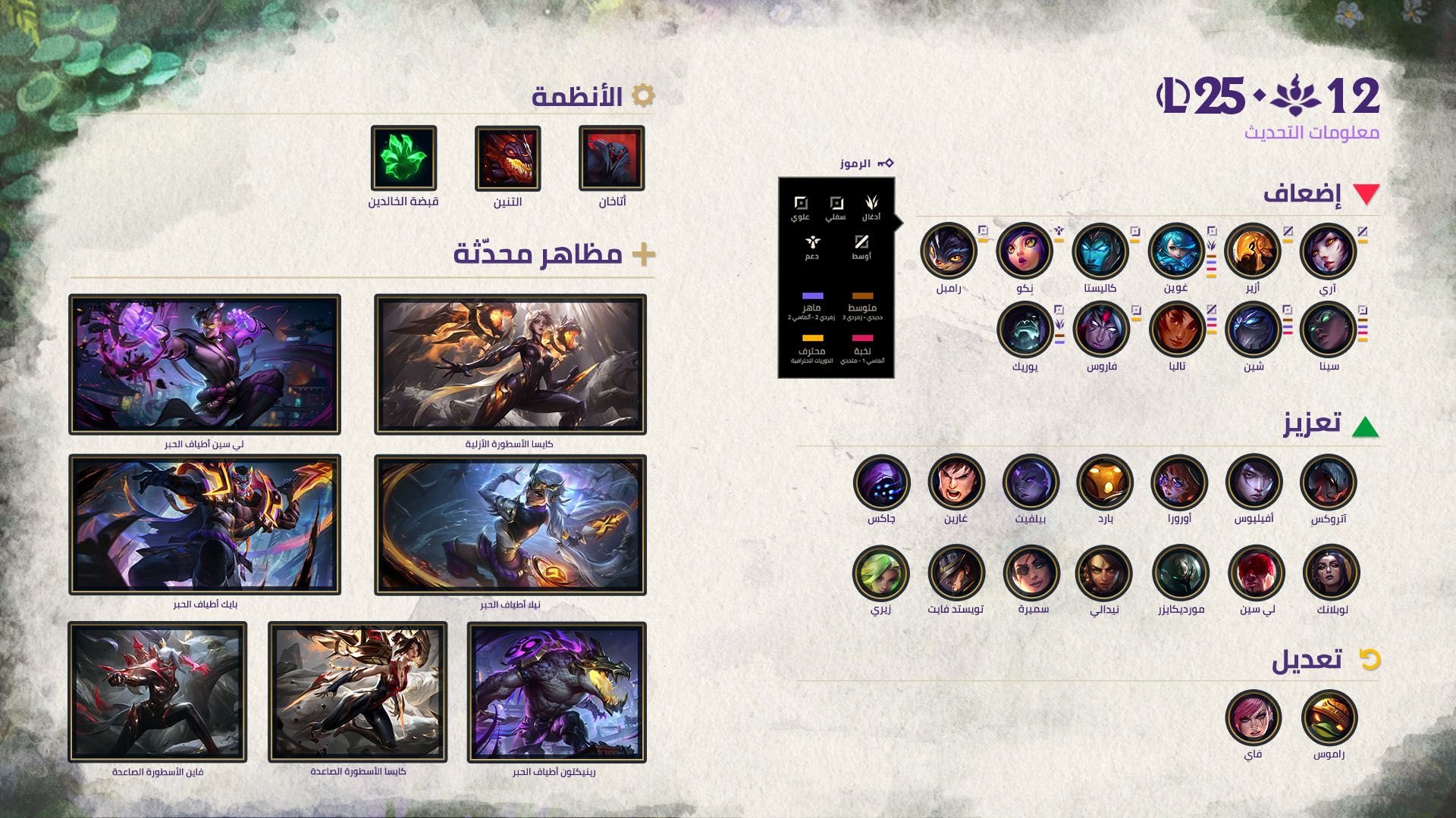 على صعيدٍ آخر، سنجري بعض التغييرات على الذهب الكامن ونقاط الخبرة في الشجار، مع مجموعةٍ من تعديلات موازنة آرام، وكأس كلاش MSI، ومجموعة جديدة من مظاهر أطياف الحبر.