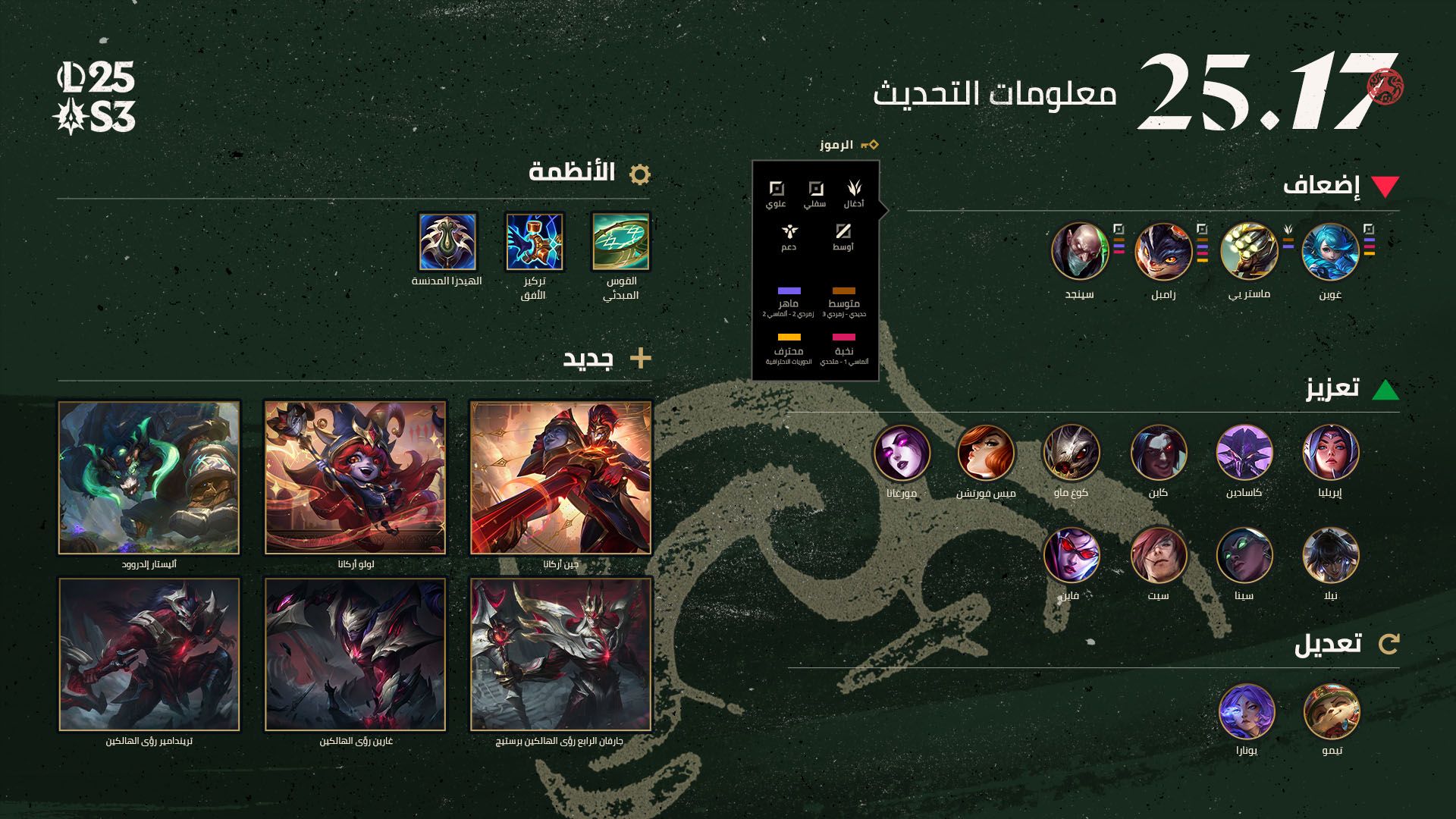 مرحبًا يا محترفي آرام ومختصيها! في هذا التحديث سنحاول تعزيز فئة المقاتل عبر منح بعض الدعم إلى أكثر العناصر التي يشيع شراؤها، وسنمنح القليل من الدعم لعناصر فئة القاتل ذات معدلات الشراء المنخفضة. نتوقع أن يكون أثر معظم التغييرات هذا التحديث فيما سبق، لكن لدينا بعض التغييرات التي تستهدف أبطالًا معينين يشذ أداؤهم عن المعقول، مثل زيغز، الذي ازدادت قوته بعد التغييرات التي طرأت عليه مؤخرًا في سامنرز ريفت، وماوكاي الذي تحلى بحكمةٍ زائدةٍ عن اللازم عند شراء العناصر. نأمل أنكم مستمتعون بالخرائط المتناوبة ونظام البطاقات الجديد. نتمنى لكم التوفيق، وعسى أن تمنحكم عمليات الاستبدال بطلكم الرئيسي دائمًا، وإلى اللقاء في آرام!