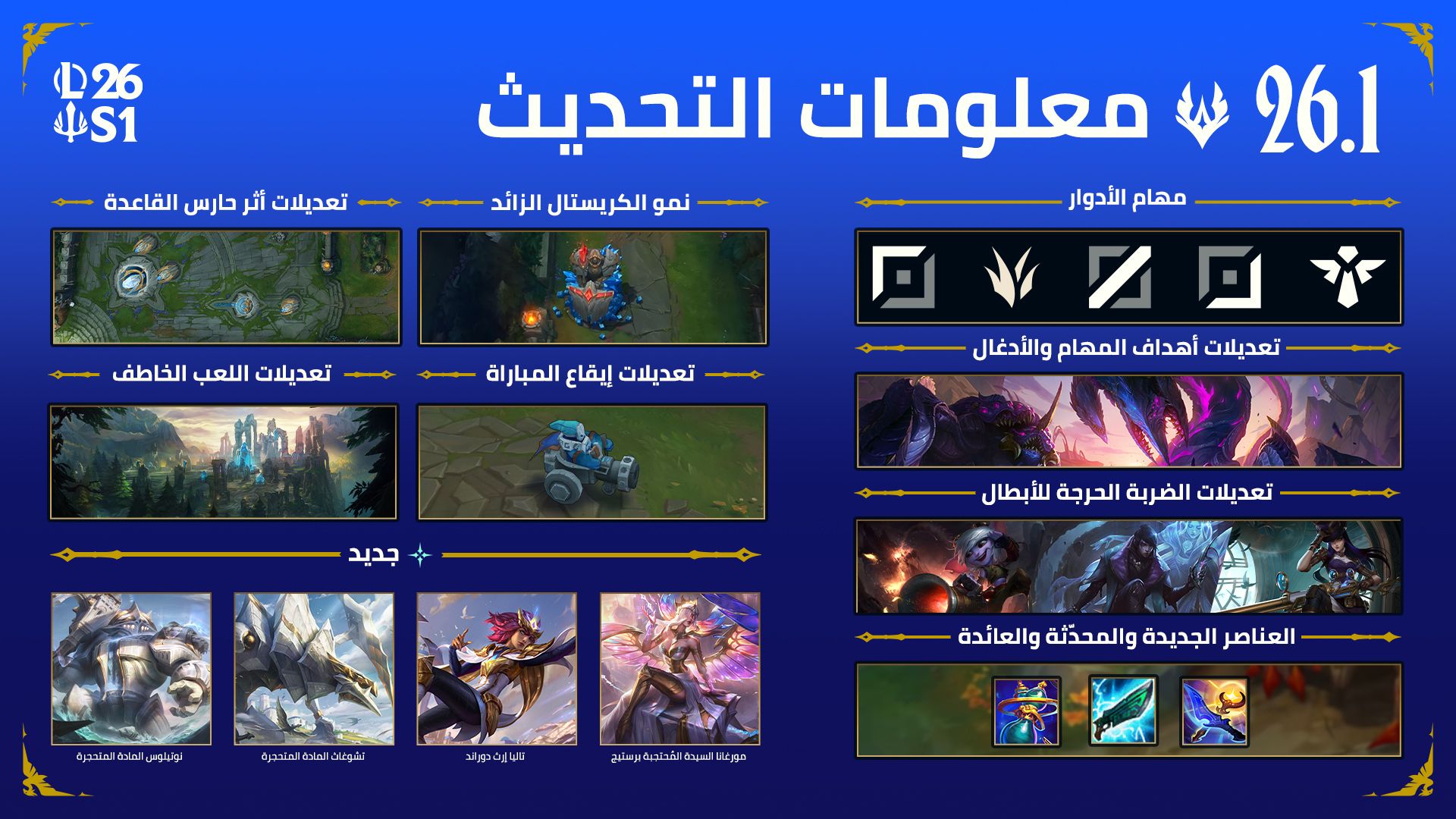 أهلًا بكم في موسمٍ جديدٍ من League of Legends! لدينا الكثير من التغييرات الواسعة في هذا التحديث، لذا إن لم تكونوا راغبين في قراءة آلاف الكلمات، إليكم موجزًا عامًا: هناك نقلة استراتيجية في بيئة اللعب نحو الضغط على أبراج الحماية وبعيدًا عن التنافس على الوحوش الخارقة مع تغييراتٍ للضبط وآلية نمو الكريستال الزائد الجديدة. كما أننا سنعيد موازنة قوة الأدوار، مع مهام الدور الجديدة لكل دور. هناك آليات رؤية جديدة بانتظاركم لتعلمها وإتقانها مع الأضواء العجيبة. وعناصر جديدة لكل فئة تبحث بلهفة عن موطئ قدمٍ في مخزونكم، بالإضافة إلى أن ضرر الضربة الحرجة الأساسي لمعظم الأبطال قد أصبح الآن 200%. هناك تغييرات جديدة على اللعب المصنف للتخفيف من وطأة الملء التلقائي. أصبحت المباريات أسرع قليلًا كذلك، في كلٍ من خريطة سامنرز ريفت المعيارية واللعب الخاطف. إذا أردتم الاطلاع على المزيد عن هذه التغييرات، نوصيكم بالاطلاع على مدونة المطورين [هنا] أو تابعوا القراءة ببساطة!