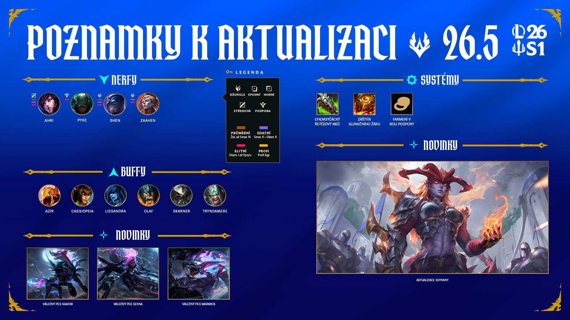 Vítejte u aktualizace 26.6! V této aktualizaci se do Žlebu řítí nová aktualizace pro Shyvanu, která přináší zbrusu nový model, vizuální efekty, dabing a skiny – to vše vyjde společně s ní! Také tu máme obvyklé úpravy vyvážení, novou sérii skinů Váleční psi a změny ve vyvážení pro Arénu a režim ARAM: Mela a spooooustu opravených chyb!