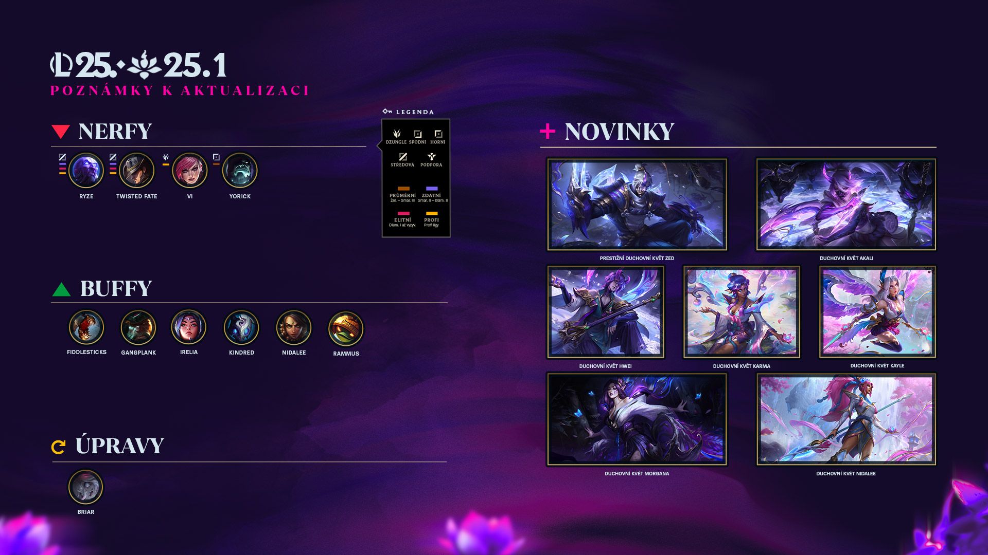 Vítejte u oficiální aktualizace pro MSI a na začátku 2. aktu Za Duchovním květem! Konečně dorazily velké novinky pro ARAM, takže můžete skočit do Koeshinské křižovatky nebo na Řeznický most a pustit se do pořádné řeže v jedné společné lajně. V tomto patchi se také vrací Aréna, a to na celý rok! Pokud vás zarmoutil její odchod, máte teď důvod k oslavám – její brány se otevřely a čeká jen na vás. Máme tu pro vás také změny u zkušeností do bitevní propustky, o kterých jsme mluvili v posledních poznámkách k aktualizaci, takže se pusťte do oněch náročných misí s mistrovstvím a užijte si sladkou odměnu v podobě BZK. Změny ve Vyvolávačově žlebu se převážně omezují na drobné ladění a dodatečné úpravy navazující na minulý patch. Posílili jsme Rammuse, který skončil po přepracování trochu slabší, než jsme očekávali, zvýšili jsme Kindredův potenciál pro týmové boje a provedli pár menších změn u nedávno upravených šampionů jako Vi, Twisted Fate a Nidalee.