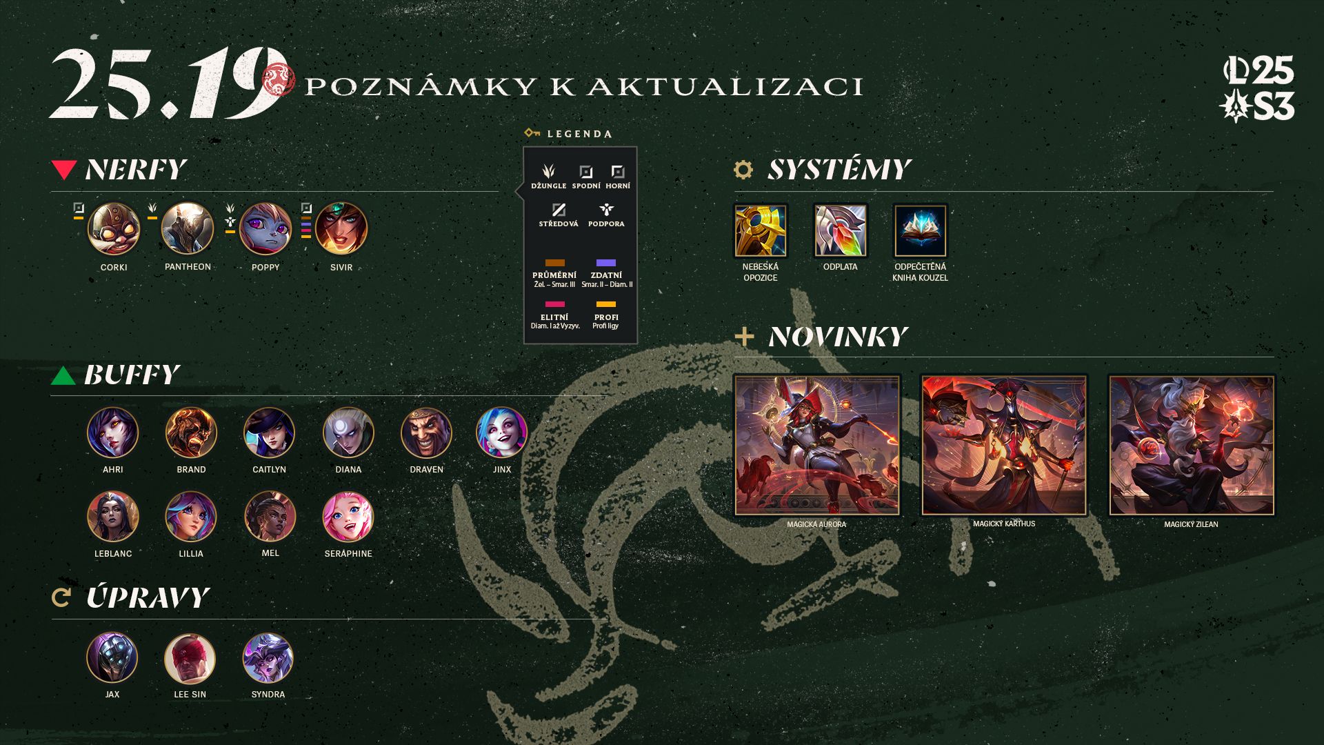 - Opravili jsme chybu, kvůli které hráči občas nemohli potvrdit roli, když ji změnili na džungli a objevilo se povinné vyskakovací okno o kouzlu Udeřit.