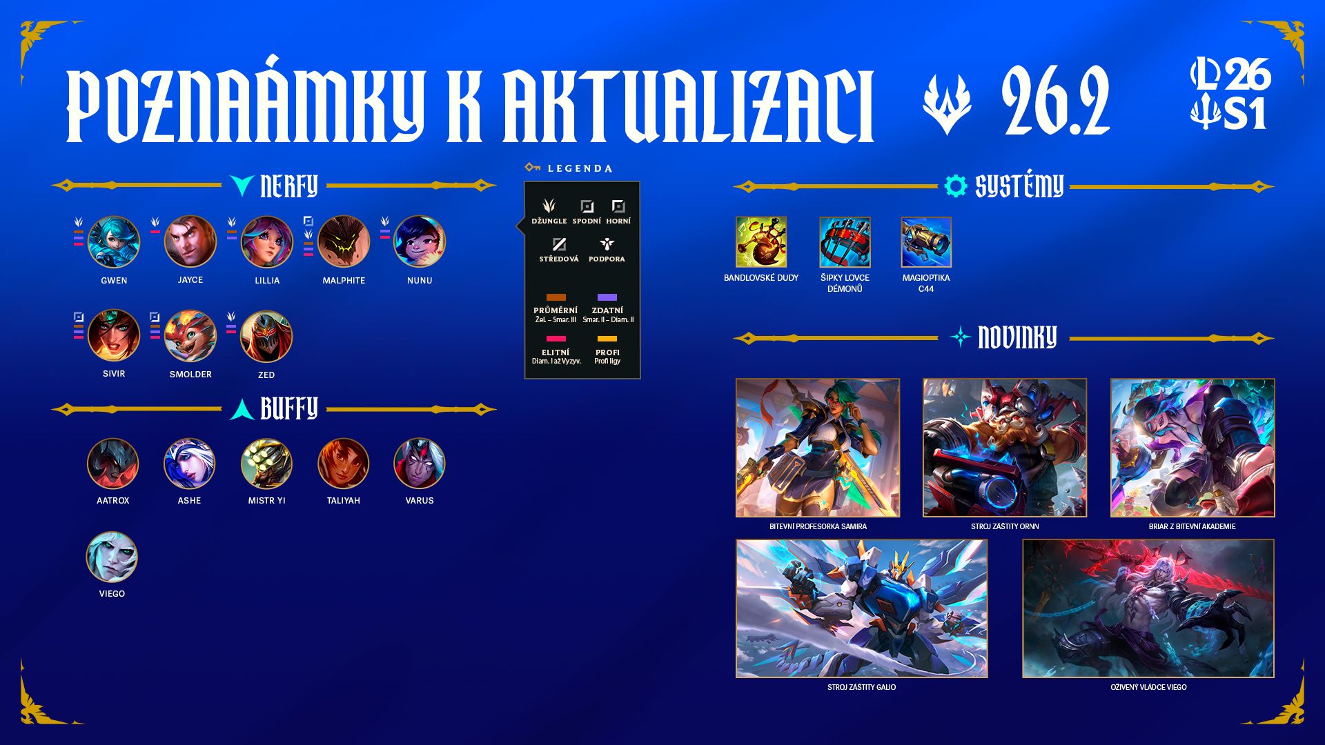 Máme tu první aktualizaci poté, co do Žlebu dorazily změny z verze 26.1, takže přinášíme jejich dodatečné vyladění, v rámci kterého trochu oslabujeme ty, kdo na novinkách nejvíc vydělali, a naopak podáváme pomocnou ruku několika šampionům, jimž se v roce 2026 zatím nedaří najít pevnou půdu pod nohama. Zároveň jsme si bedlivě prostudovali vaše připomínky k provedeným úpravám a budeme dál monitorovat jejich dopad, zatímco si na ně budete zvykat a přizpůsobovat se jim. Pokud vás zajímají podrobnosti ohledně toho, jak si změny z aktualizace 26.1 ve hře nakonec vedly, přečtěte si níže uvedenou sekci výstižně pojmenovanou „Jak dopadly změny z aktualizace 26.1“.