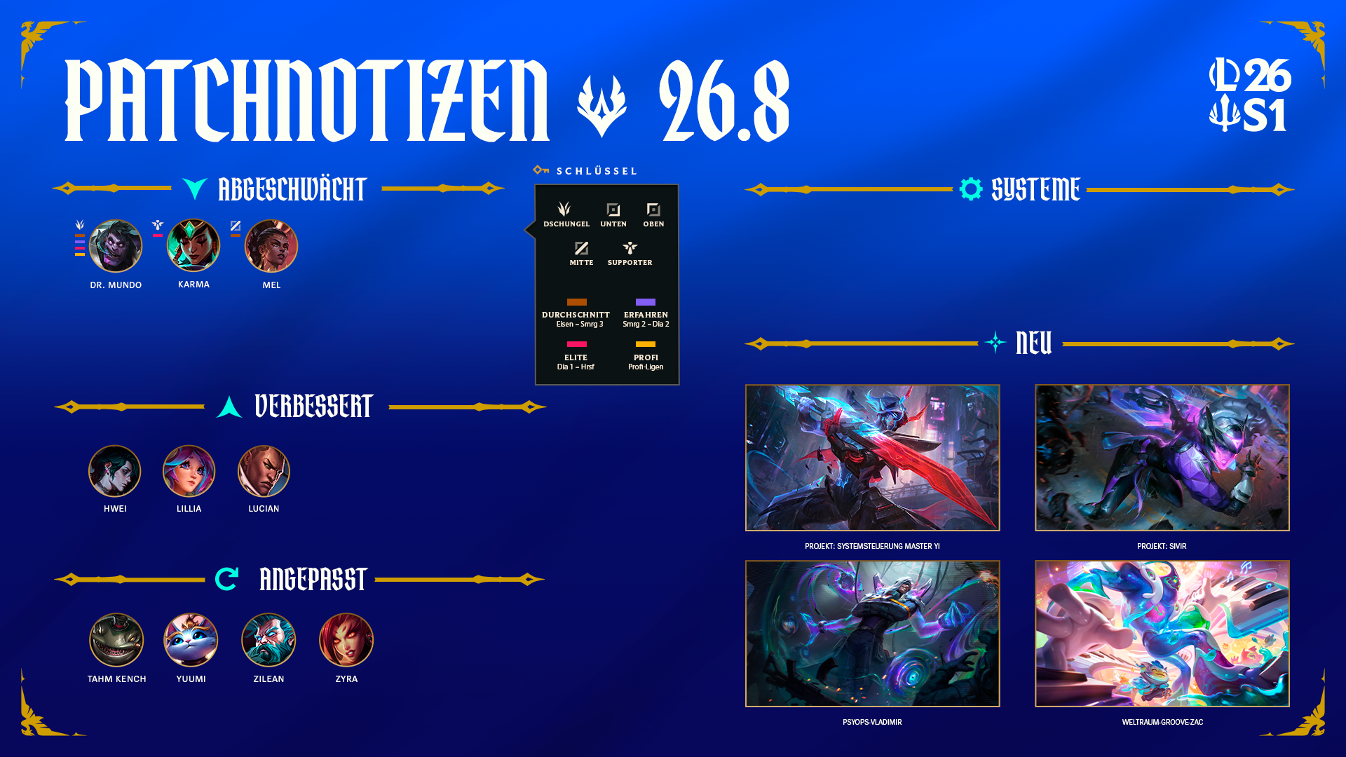 Im Patch dieser Woche gibt es einige Änderungen an den derzeit stärkeren Champions wie Mel und Dr. Mundo, während wir gleichzeitig schwächelnden Champions wie Lucian und Hwei unter die Arme greifen. Wir haben außerdem einige Änderungen vorgenommen, um zu verhindern, dass Spieler auf Stufe 1 unbrauchbare Fähigkeiten wie bei Zyra und Zilean wählen.