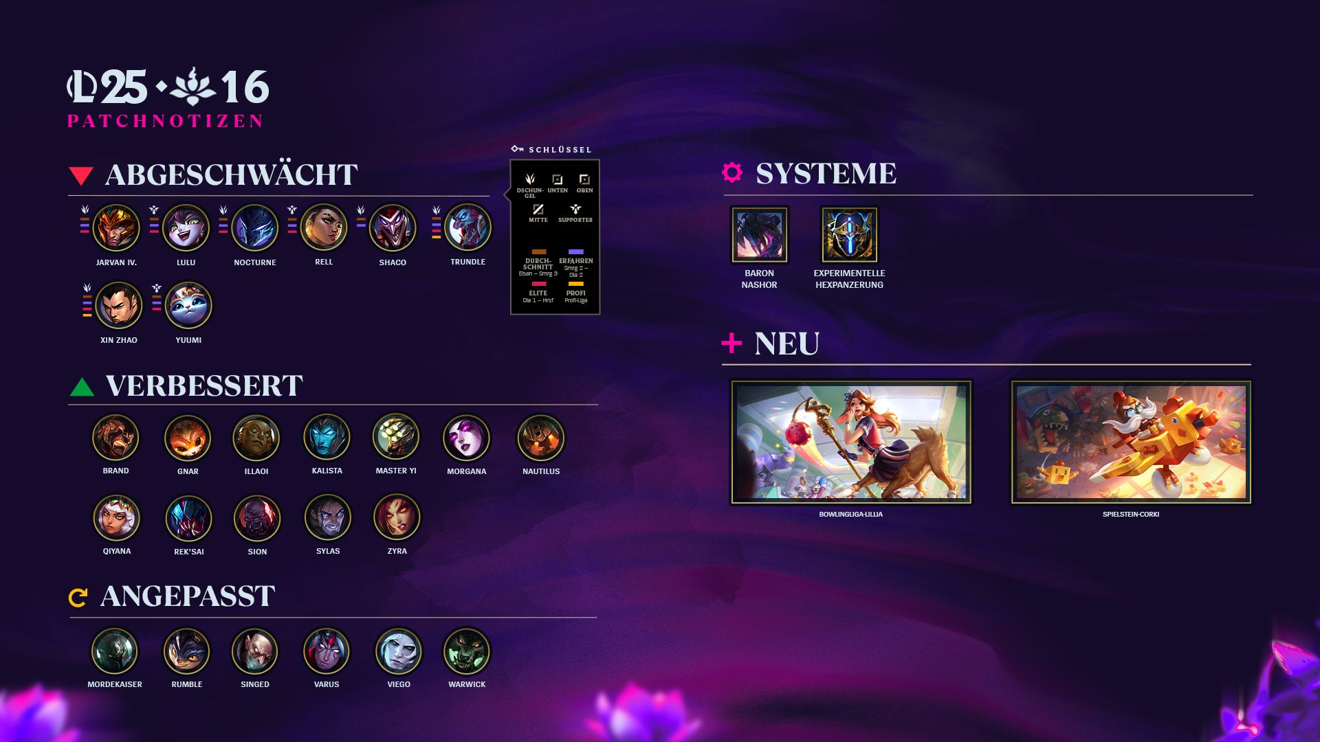 Die Gameplay-Aktualisierungen für die Live-Server in diesem Patch sollen das Metaspiel aufmischen, den Championpool um neue Jungler erweitern, die schwächsten Magier-Supporter verstärken, ein paar der stärksten Champions abschwächen und einige alternative Kombinationen ermöglichen. Wir bauen auf den letzten Änderungen an Rek’Sai und Illaoi auf und verleihen ihnen die Macht, die sie verdienen. Außerdem beheben wir langjährige Probleme von Singed und Rumble, die die beiden auf der roten Seite wesentlich schwächer gemacht haben.