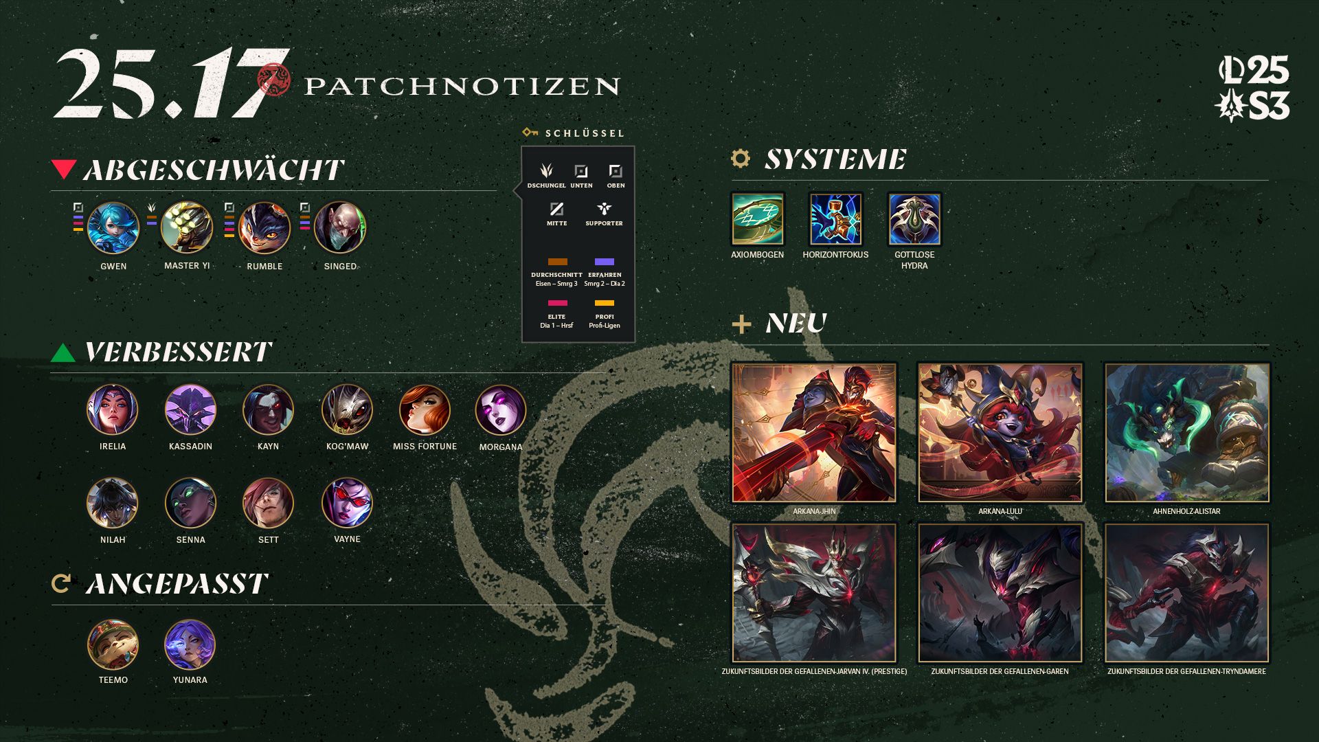 Willkommen zu Saison 3! In diesem Patch veröffentlichen wir jede Menge Aktualisierungen fĂŒr das Spiel. Dazu zĂ€hlen die RĂŒckkehr der normalen âKluft der Beschwörerâ-Karte fĂŒr Saison 3, die RĂŒckkehr von âHorror-Botsâ, eine groĂe visuelle Ăberarbeitung fĂŒr Xin Zhao, ein neuer Kampfpass, Verbesserungen an der Ăbersicht ĂŒber Spielinformationen wie Dschungel-Timer und jede Menge Komfortverbesserungen und Fehlerbehebungen. AuĂerdem haben wir noch Balanceanpassungen fĂŒr ARAM und eine Ruhm-ZurĂŒcksetzung fĂŒr die Arena in petto!