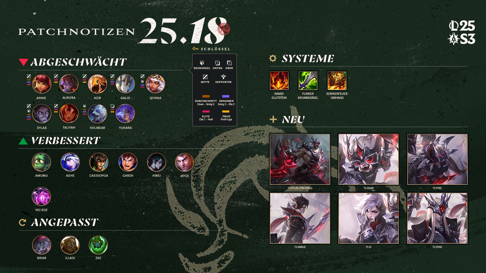- Kurz nach der Veröffentlichung von Patch 25.17 haben wir einen Hotfix an den Dschungel-Timern vorgenommen, die sofort alle Informationen über die Zeit bis zum Wiedererscheinen des Lagers anzeigten und Sicht darauf gewährten. Nun erhältst du die Timer-Informationen 10 Sekunden vor dem Wiedererscheinen von Standardlagern oder 60 Sekunden vor dem Wiedererscheinen von Buff-Lagern, was der Funktionsweise in der Vergangenheit entspricht.