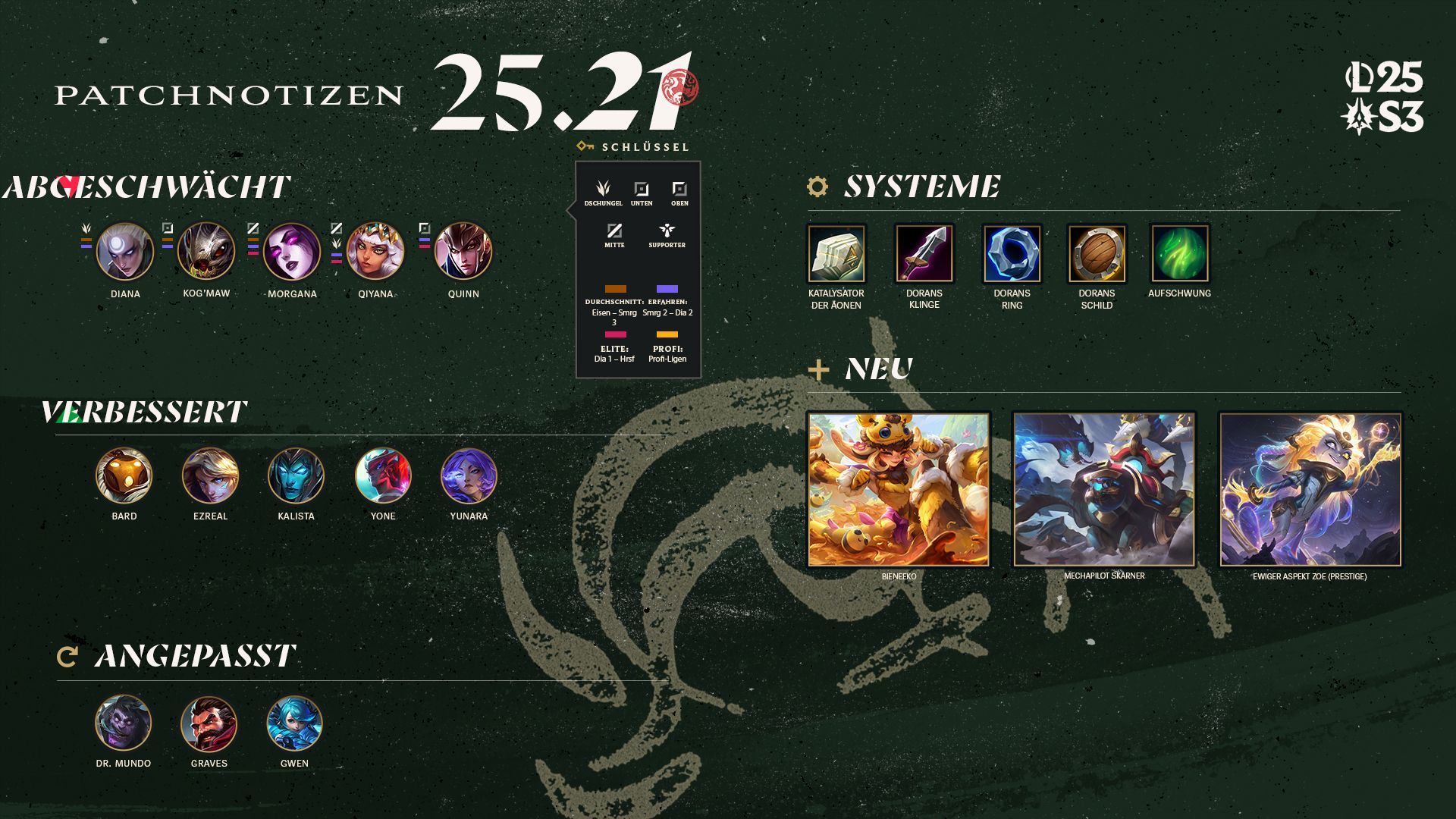 Wir sind mit Bards aktueller Balance ziemlich zufrieden, möchten ihm jedoch etwas mehr Optionen in der Form von GegenstĂ€nden mit FĂ€higkeitsstĂ€rke wie Shurelyas zur VerfĂŒgung stellen, durch die er sein Team besser unterstĂŒtzen kann, wenn er vor allem auf FĂ€higkeitsstĂ€rke setzt.