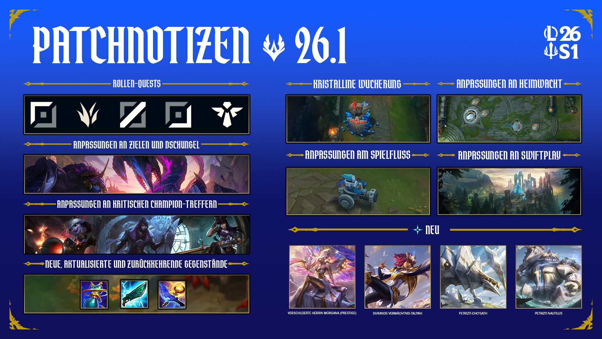 Neben den neuen saisonalen Ănderungen haben wir die neue Karte fĂŒr die Kluft der Beschwörer mit Demacia-Motto, Ănderungen an der Spielbalance von âARAM: Chaosâ, eine Ăberarbeitung von Swiftplay, damit es noch swifter wird, Sachen zur Lobby-Erpressung und mehr!