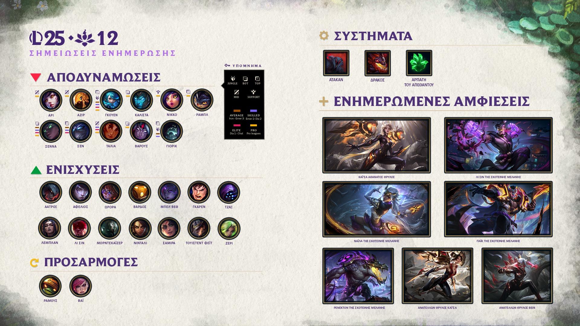 Σε άλλα νέα, κάναμε επίσης κάποιες αλλαγές στην παθητική απόκτηση Χρυσού και την Εμπειρία στον Καβγά, ένα σετ αλλαγών ισορροπίας στο ARAM, ενώ έχουμε και το Κύπελλο MSI Clash και ένα νέο σετ αμφιέσεων της Σκοτεινής Μελάνης.