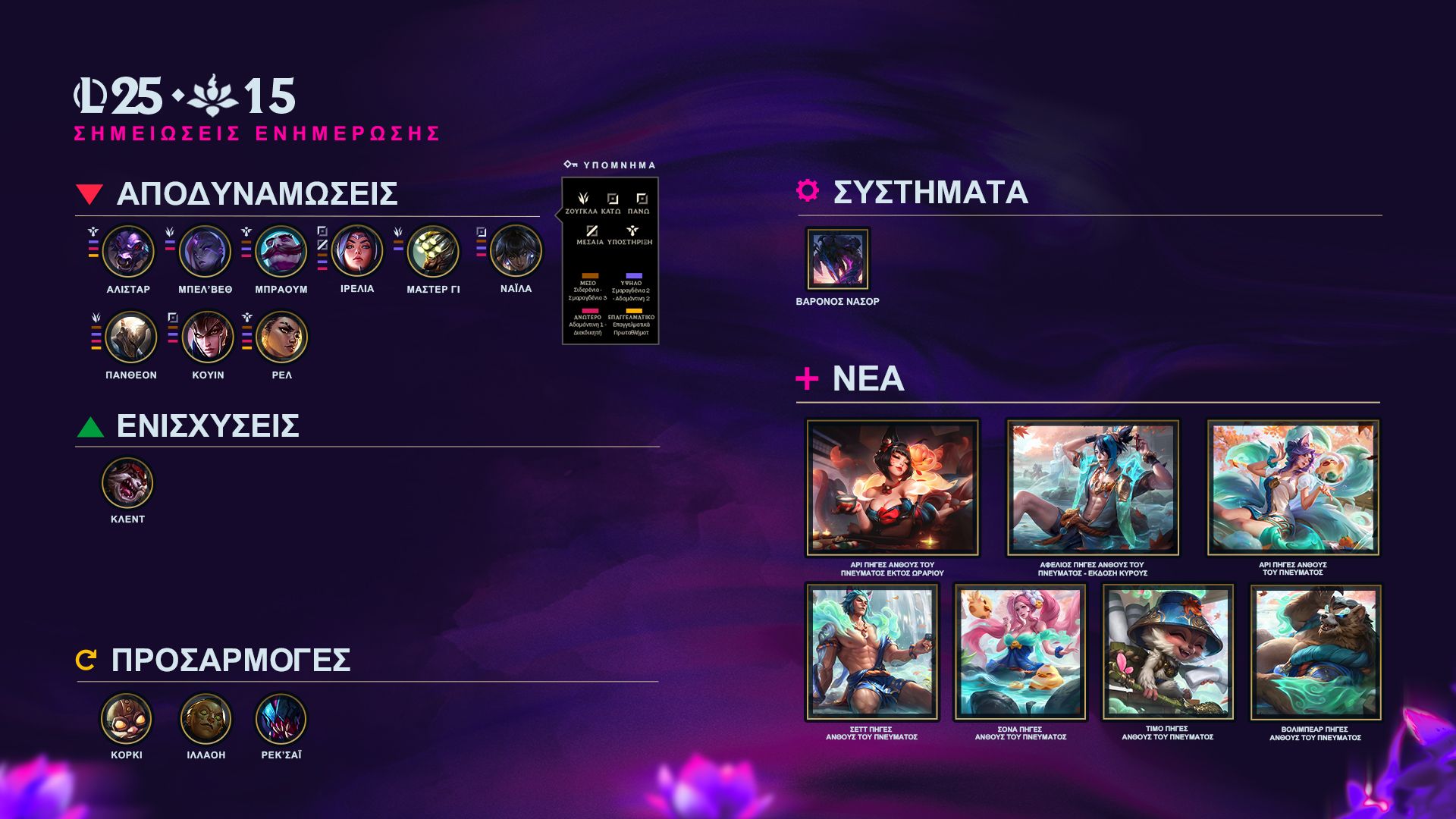 Ελάτε να χαλαρώσετε στις Θερμές Πηγές και να ενημερωθείτε σχετικά με όσα έχουμε ετοιμάσει για την Ενημέρωση 25.15! Σε αυτή την Ενημέρωση έχουμε τις συνηθισμένες μας αλλαγές ισορροπίας για το Φαράγγι και το ARAM και μια σειρά από διορθώσεις σφαλμάτων! Έχουμε επίσης μια νέα προσθήκη, τις Προεπισκοπήσεις Ικανοτήτων Ηρώων, όπου μπορείτε να βλέπετε τα κιτ των Ηρώων πριν και μετά την επιλογή, αν έχετε καιρό να παίξετε με τους συγκεκριμένους Ήρωες και χρειάζεστε μια υπενθύμιση. Δοκιμάστε τη νέα δυνατότητα και πείτε μας τη γνώμη σας!