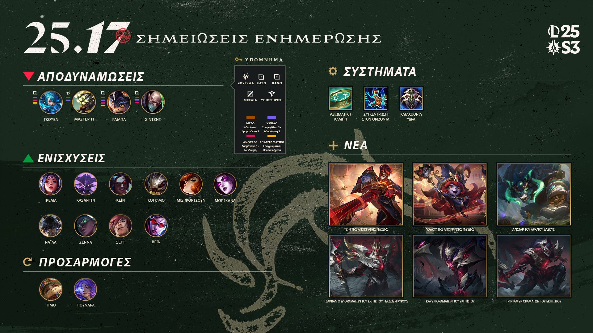 Είναι η δεύτερη διαδοχική Ενημέρωσή μας με έμφαση στα νέα εργαλεία που μπορείτε να αξιοποιήσετε και να κατακτήσετε. Έχουμε για πρώτη φορά τη Βέιν και τον Σεττ στη Ζούγκλα, την Ιρέλια με Ισχύ Ικανότητας, τον Κέιν στις λωρίδες, ενώ παράλληλα ενισχύσαμε ορισμένα αδύναμα αντικείμενα που ελπίζουμε ότι θα φέρουν αλλαγές στα build Εκτελεστών Ζημιάς Επίθεσης και στα build Επιτάχυνσης με Ισχύ Ικανότητας. Έχουμε και μερικές ενημερώσεις ισορροπίας μικρότερης κλίμακας, πολλές από τις οποίες διορθώνουν άλλες αλλαγές που κάναμε πρόσφατα.