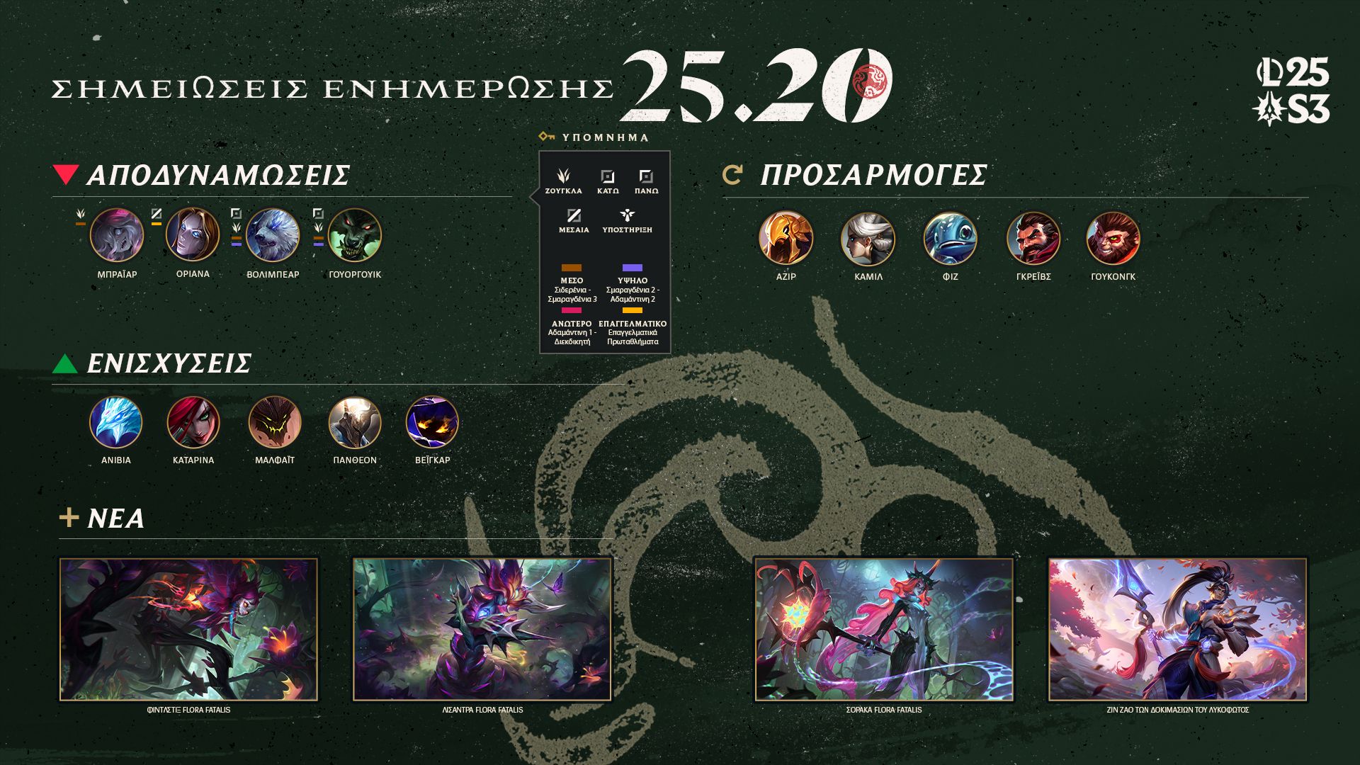 Καλώς ορίσατε στην επίσημη Ενημέρωση του Παγκόσμιου Πρωταθλήματος League of Legends 2025! Καθώς οι περισσότερες από τις αλλαγές που επικεντρώνονται στο επαγγελματικό παιχνίδι κυκλοφόρησαν στην τελευταία ενημέρωση, φροντίζουμε ιδιαίτερα να διασφαλίσουμε ότι οι αλλαγές αυτής της ενημέρωσης ταιριάζουν τόσο στους επαγγελματίες παίκτες όσο και σε εμάς τους υπόλοιπους στο σπίτι. Έτσι, προσφέρουμε κάποιες ενισχύσεις για τους Ήρωες που έχουν χαμηλότερη απόδοση όταν συγκρίνουμε έμπειρους παίκτες με έμπειρους παίκτες άλλων Ηρώων, κάποιες αποδυναμώσεις σε Ήρωες που αποδίδουν εδώ και καιρό πολύ καλά σε χαμηλότερα επίπεδα δεξιοτήτων και ένα σύνολο προσαρμογών που στοχεύουν στην ενίσχυση ή την αποδυνάμωση της ισχύος στο επαγγελματικό παιχνίδι χωρίς να επηρεάζονται τα συνολικά ποσοστά νίκης για το Κανονικό παιχνίδι και το παιχνίδι Κατάταξης.