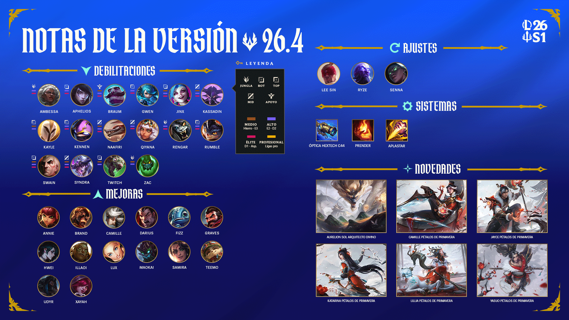 En la versión de esta semana, empezamos el año del caballo con buen pie gracias a una de las mejores campeonas que han trotado por la Grieta: ¡Lillia! ¡Y eso por no hablar del montón de preciosos aspectos de Pétalos de primavera! Además, contamos con una aparición especial de Aurelion Sol arquitecto divino de porcelana. Enseguida profundizaremos en los cambios específicos de la Grieta del Invocador, pero también tenemos sorpresas para ARAM: Caos y Arena en esta versión. No olvidéis echarle un vistazo al Clash de la Copa de Jonia que tendrá lugar en ARAM durante esta versión.