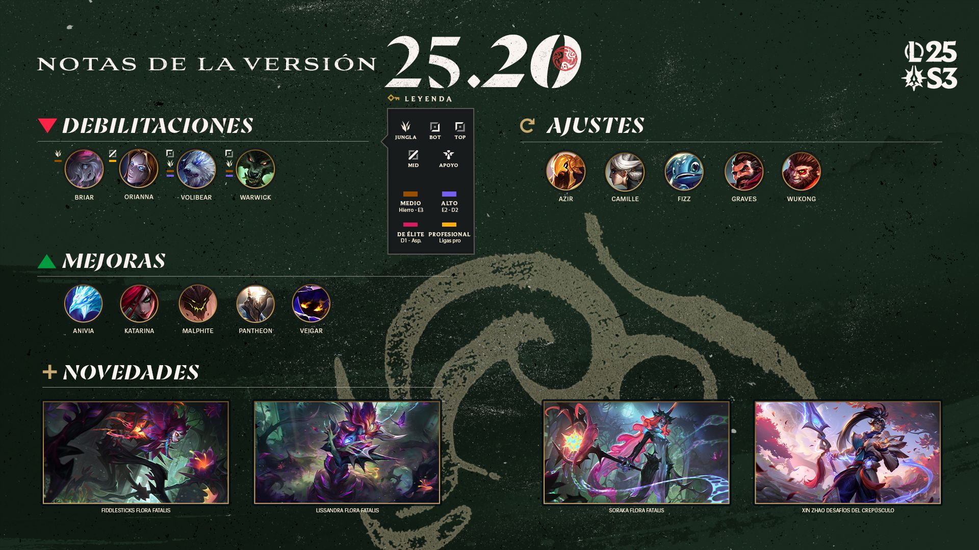 ¡Os damos la bienvenida a la versión oficial del Campeonato Mundial de League of Legends 2025! Dado que la mayoría de nuestros cambios dirigidos al panorama profesional se produjeron en la última versión, vamos a tener especial cuidado para que los de esta versión encajen bien tanto en ese ámbito como para el resto de los mortales. Como resultado, tenemos preparadas algunas mejoras para campeones que no estén rindiendo en manos de jugadores experimentados en comparación con jugadores experimentaos de otros campeones, debilitaciones para quienes llevan tiempo pasándose de la raya en los niveles de habilidad más bajos, y una serie de ajustes que pretenden aumentar o disminuir el poder en profesional sin que los índices de victorias generales de la cola normal y la clasificatoria se vean afectados.