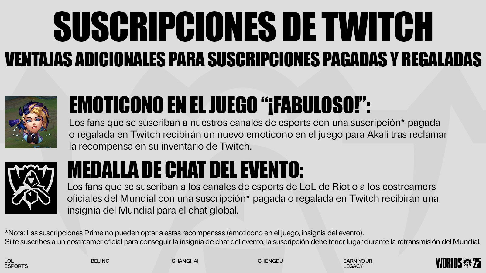 Medalla de chat del evento: Los fans que se suscriban a los canales de esports de LoL de Riot o a los costreamers oficiales del Mundial con una suscripción* pagada o regalada en Twitch recibirán una insignia del Mundial para el chat global.