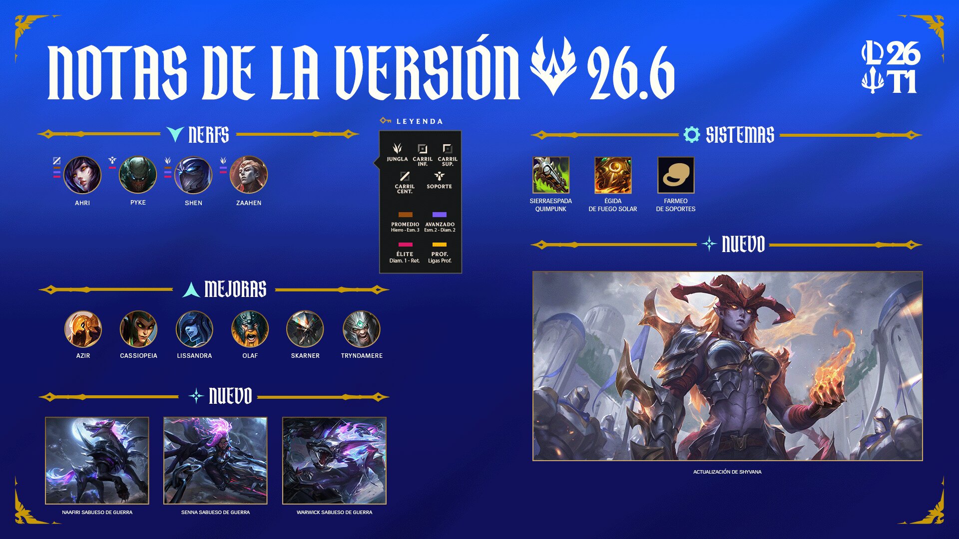 ¡Les damos la bienvenida a la versión 26.6! Esta semana, la nueva actualización de Shyvana, que incluye modelos, efectos visuales, diálogos y aspectos completamente renovados, llegará a LoL tan pronto como lancemos la versión. Además de los típicos ajustes de balance, tenemos una nueva línea de aspectos, Sabuesos de Guerra, así como una tanda de ajustes de balance tanto para Arena como para ARAM: Caos, ¡con un montón de correcciones de errores!