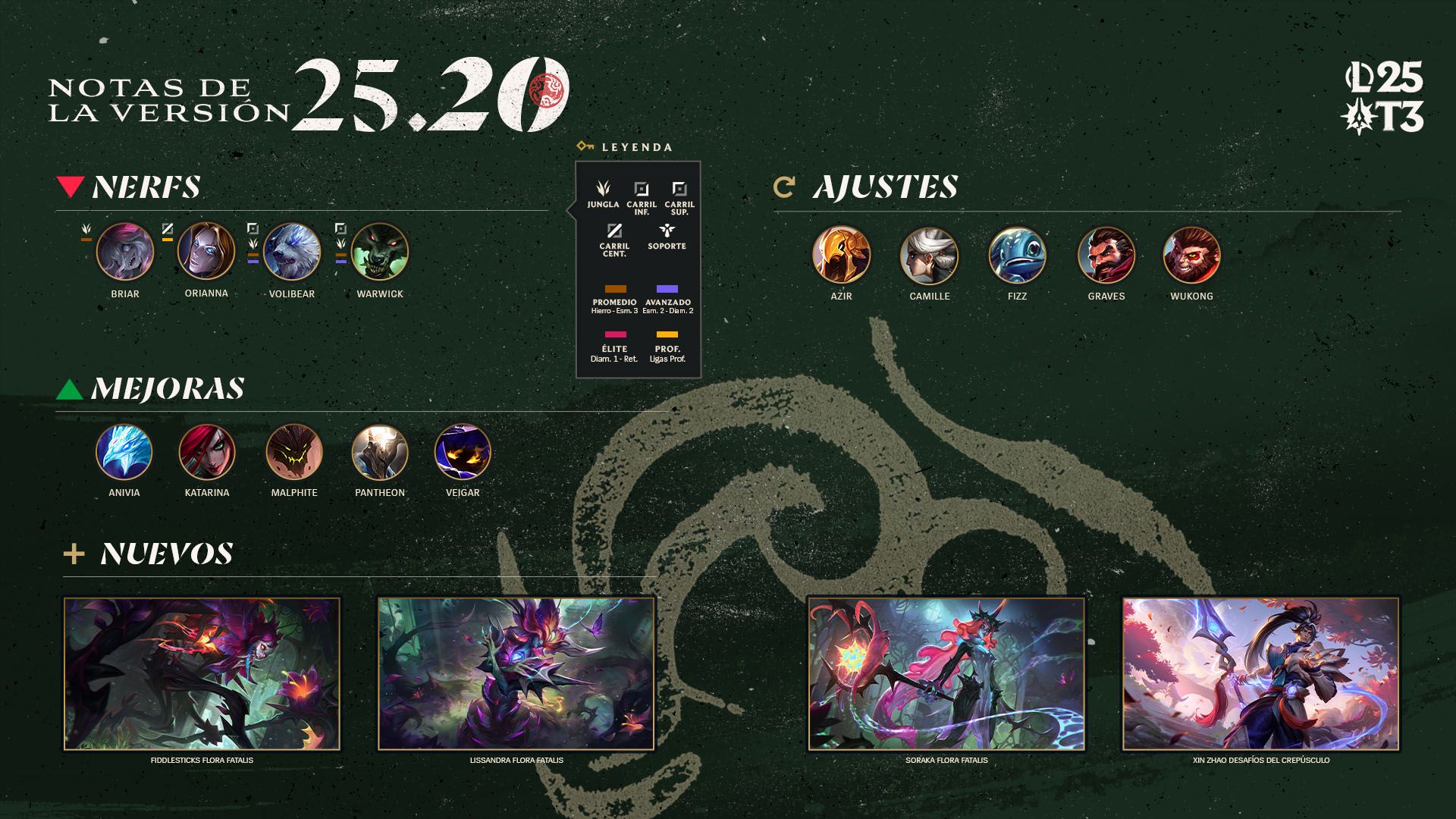 ¡Les damos la bienvenida a la versión oficial del Campeonato Mundial de League of Legends 2025! Dado que implementamos la mayoría de los cambios orientados al juego profesional en la versión anterior, actuaremos con cuidado para asegurarnos de que los ajustes de esta actualización abarquen tanto a los profesionales como a los simples mortales que jugamos LoL desde casa. Por eso, implementaremos un par de mejoras para los campeones que tienen un desempeño más deficiente que los demás cuando están en manos de jugadores experimentados, algunas debilitaciones para aquellos campeones que tienen un desempeño superior a la media hace tiempo en los niveles de habilidad más bajos, y una serie de ajustes que aumentarán o reducirán el poder de ciertos campeones en el ámbito profesional sin afectar sus tasas de victoria en las partidas normales y clasificatorias.