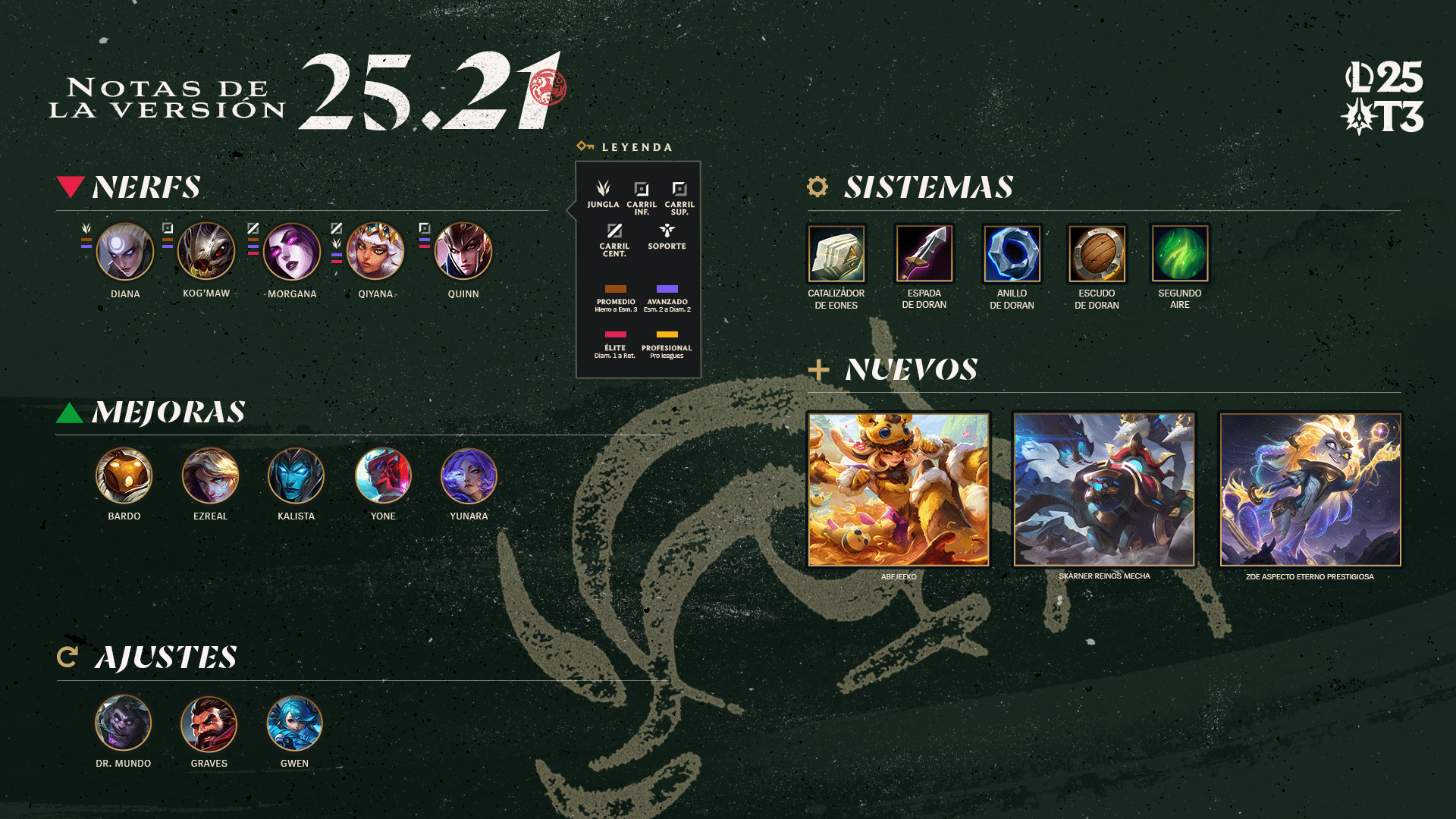 A principios de año (en la versión 25.02, también conocida como versión 25.T1.2), ajustamos los requisitos mínimos del sistema porque actualizamos LoL: ahora, se ejecuta con el nivel de función 11_0 de DirectX 11 para los usuarios de Windows y con Metal para los usuarios de Mac. Tras el lanzamiento de la versión 25.21, estas características serán obligatorias, así que su sistema tendrá que ser compatible con estas tecnologías gráficas si quieren seguir jugando League of Legends. Si ya cumplen con los requisitos mínimos del juego, no tendrán ningún problema y no notarán ninguna diferencia cuando actualicen el cliente a la versión 25.21. De no ser así, el botón ''Jugar'' estará en color gris y verán una ventana emergente que les dirá que deben actualizar su hardware para volver a jugar LoL.