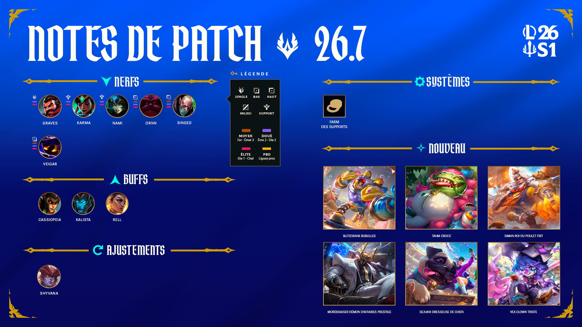 Nous vous proposons un petit patch d'équilibrage, car nous nous concentrons sur la mise à jour de la saison 2 qui arrive le mois prochain. Nous avons apporté quelques ajustements aux supports, avec Nami et Karma qui dominent largement à haut niveau de jeu, tandis que Rell a quasiment disparu. Par ailleurs, nous nerfons principalement les champions qui s'en sortent beaucoup mieux que les autres.