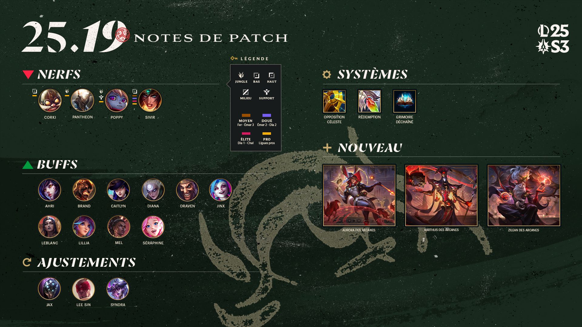 Pour ce qui est des buffs, notre objectif est toujours de favoriser les compétences clés de chaque champion pour les rendre plus simples à utiliser et pour supporter leurs schémas d'utilisation. Pour les changements des objets, nous continuons notre évaluation des délais de récupération pour que certains objets soient plus intéressants, surtout en tenant compte du rythme de jeu plus rapide de l'ARAM. Nous voudrions améliorer le niveau de satisfaction des objets et leur viabilité à travers les différents rôles et styles de jeu. Merci d'être venus voir les changements, et on se voit sur un des ponts !