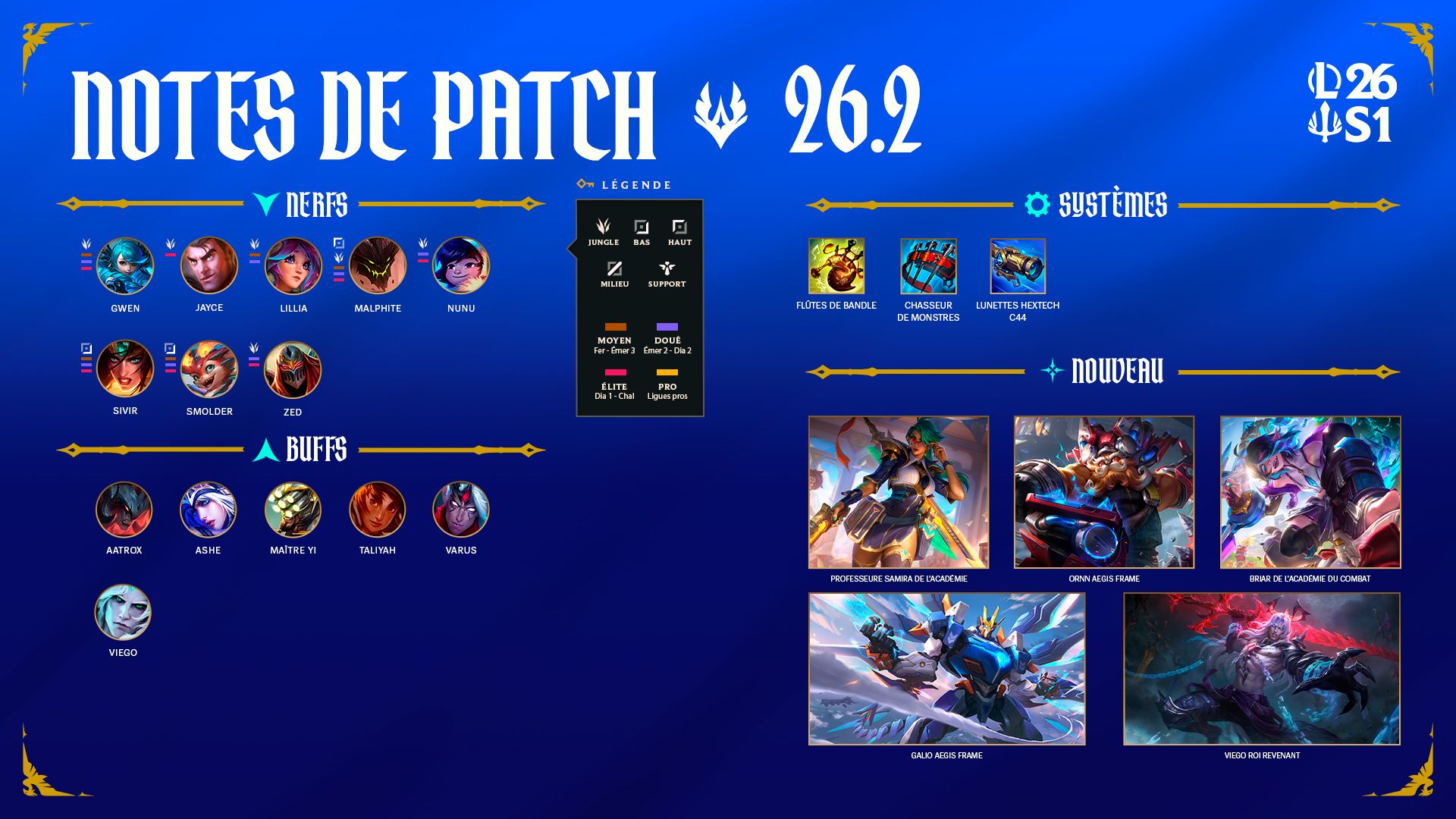 Il s'agit de notre premier patch après les changements que le patch 26.1 a apportés à la Faille, nous allons donc faire un état des lieux, ramener sur terre ceux qui ont pris la grosse tête et donner un coup de main aux champions qui ont du mal à trouver leur rythme en 2026. Nous avons bien sûr lu vos retours quant aux nouveaux changements et nous continuons de surveiller leurs effets sur le jeu à mesure que vous les découvrez et que vous vous y adaptez. Si vous voulez en savoir davantage sur notre ressenti quant aux résultats des changements du patch 26.1, ne ratez pas la section intitulée « Notre ressenti quant aux changements du patch 26.1 » un peu plus bas.