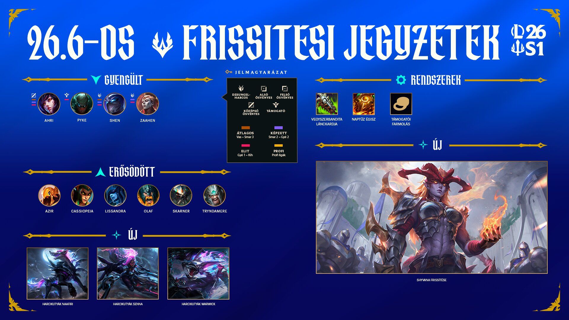 Üdvözlünk a 26.6-os frissítésben! Az e heti frissítésben megérkezik a Szurdokba Shyvana új frissítése, vadonatúj modellel, vizuális effektusokkal, szinkronnal és kinézetekkel, amelyek a megjelenésével egy időben válnak elérhetővé! Emellett a szokásos játékegyensúly-módosítások, az új Harcikutyák kinézetcsalád, valamint az Aréna és az ARAM: Káosz játékegyensúly-módosításai is érkeznek egy rakat hibajavítás kíséretében!