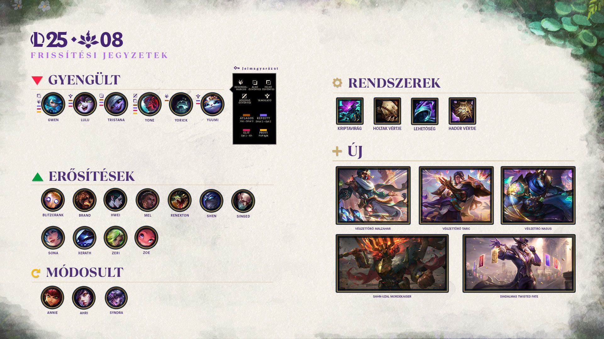 Érkezik a 25.08-as frissítés! Játékegyensúllyal kapcsolatos módosítások minden aktív várólistán. Ez az aktuális rangsorolt szezon utolsó frissítése, egyben az utolsó lehetőség a Diadalmas Twisted Fate megszerzéséhez szükséges 15 győzelem elérésére!