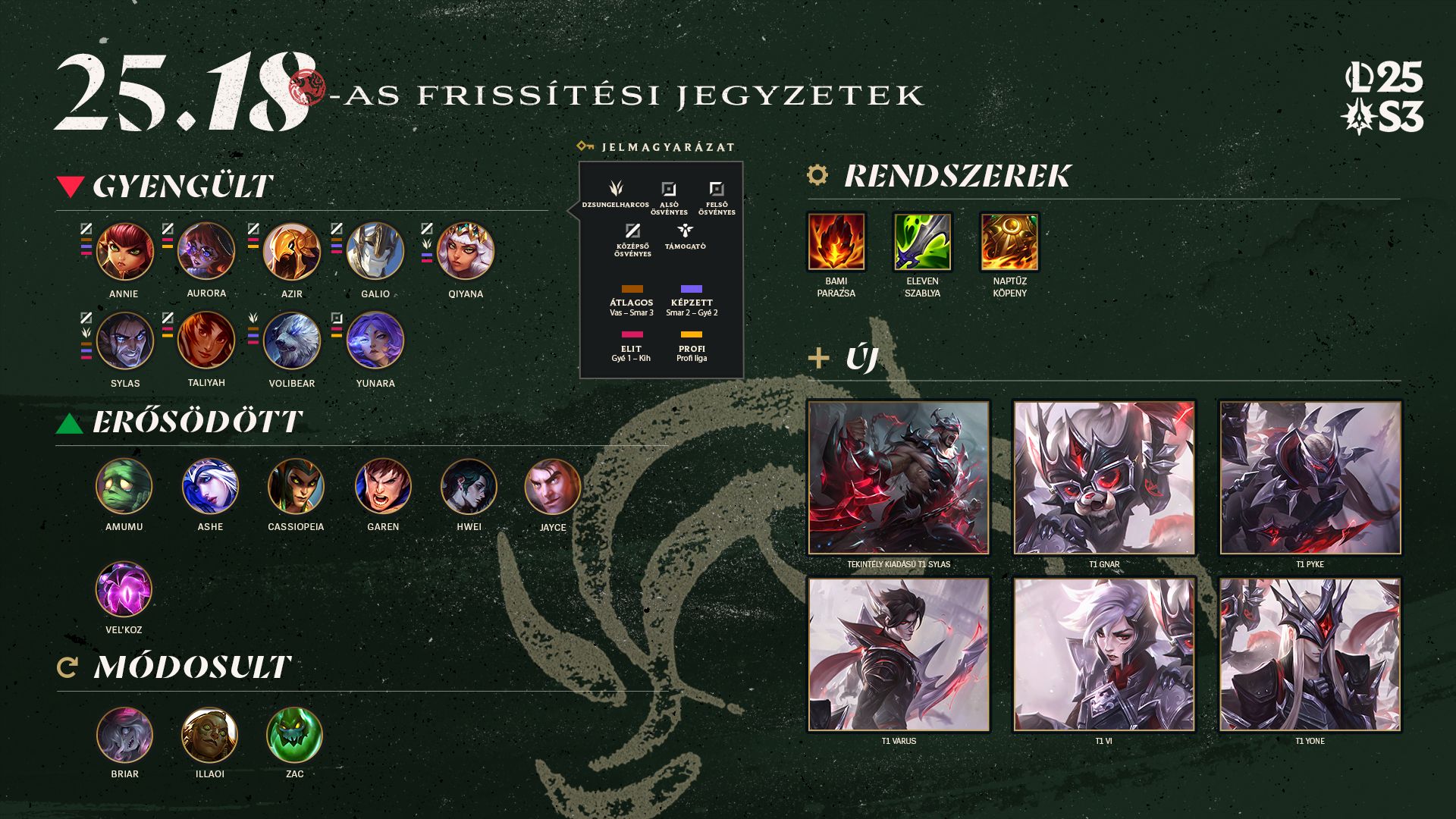 A mostani frissítésben nem nyúlunk bele a hősszerepekbe, csak a játékegyensúlyt finomhangoljuk. Pár kiemelt változás: a Bami parazsa erősödik a dzsungeleseknek, kényelmi változtatások Illaoi háza táján, az első nagy gyengítések Yunarához, Qiyanához és a dzsungeles Sylashoz.