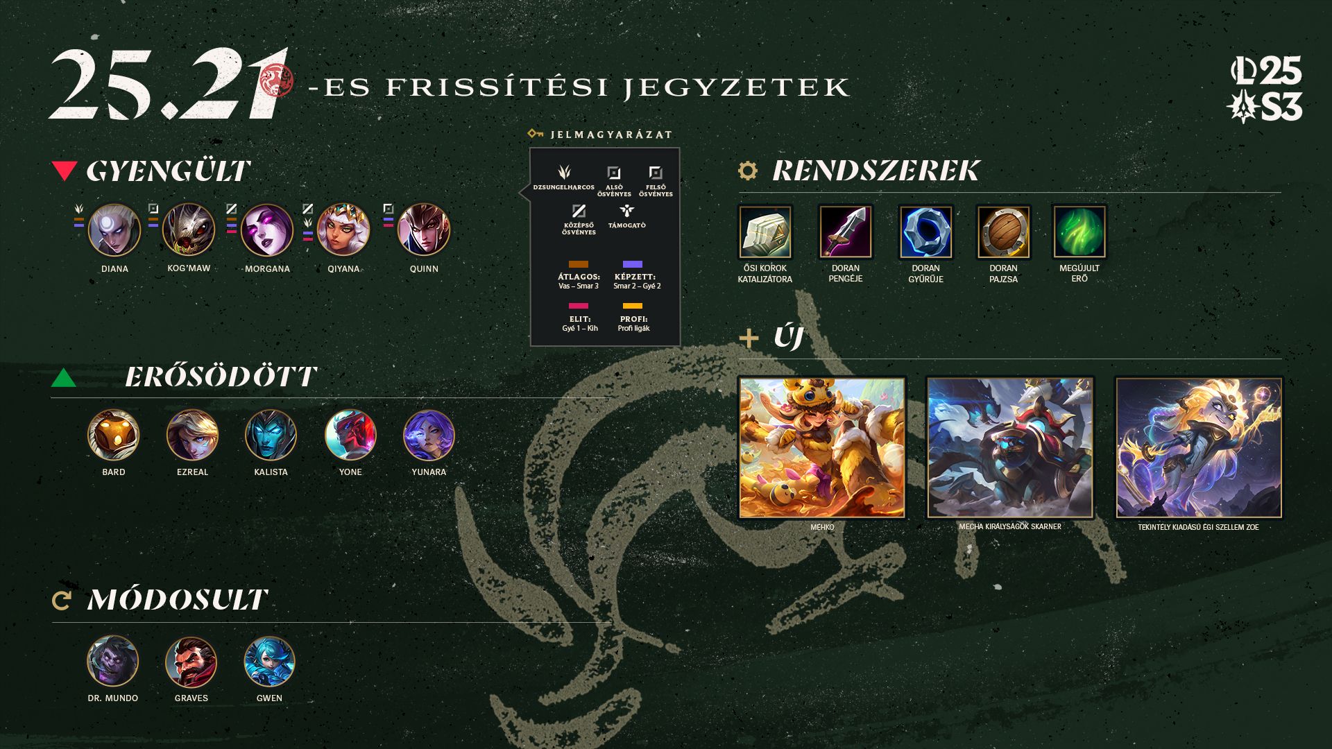 A 25.21-es frissítéssel megérkezik az év utolsó szezonális belépője! Érdemes teljesíteni a feladatokat, mert olyan jutalmak várnak, mint Méhko, Mecha királyságok Skarner, Tekintély kiadású Égi szellem Zoe, valamint hangulatjelek, ikonok és sok minden más!