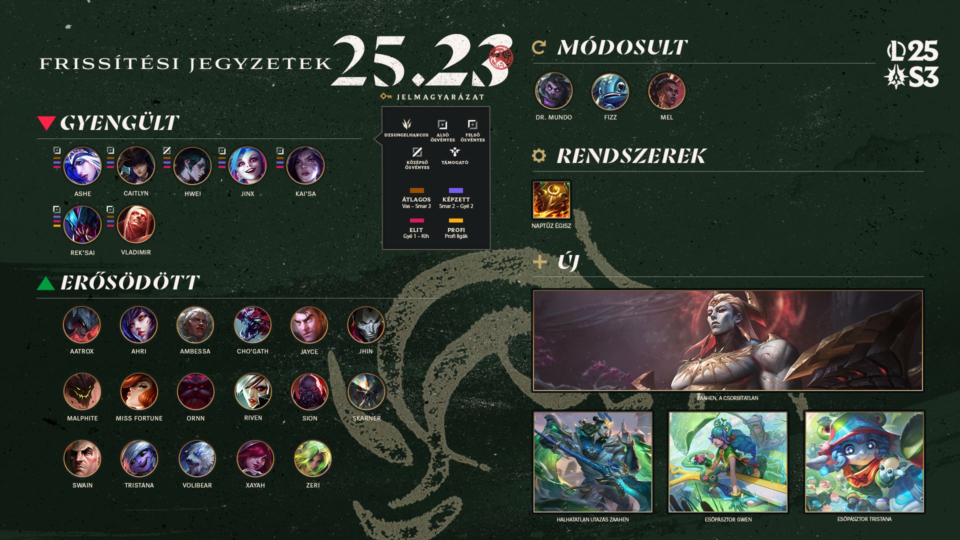 Ó, az irónia: Aatrox VGU-jának tervezésekor még a dzsungel volt tervben számára, csak a fejlesztés későbbi szakaszában dőlt el, hogy felső ösvényes lesz. Nagyon érdekes hős szórakoztató játékmenettel, ezért enyhítünk a maximális életerővel arányos sebzése korlátozásán, és további segítséget nyújtunk neki a dzsungelben. Az is kiderül, mennyire jön be neki az új szerep.