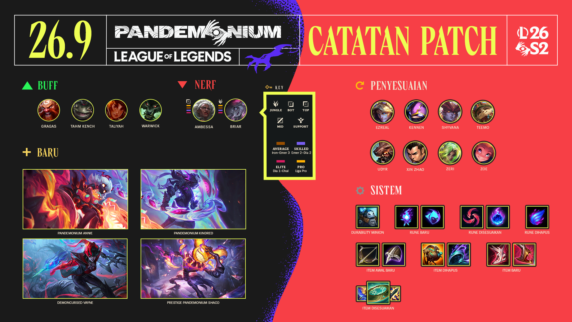 Di patch kali ini, ada banyak pembaruan untuk champion, item, sistem, dan rune. Ada juga beberapa item favorit lama yang hadir kembali seperti Deathfire Touch dan Stormraider's Surge, serta banyak opsi baru yang bisa dicoba seperti item awalan baru dan berbagai build champion alternatif. Untuk misi role, ada beberapa perubahan keseimbangan, penyesuaian agar progres misi jadi lebih mudah, serta sedikit rework pada reward misi mid lane supaya lebih cocok dengan fantasi scaling. Terakhir, kami memberi perhatian khusus pada Shyvana supaya ada perbedaan yang lebih jelas antara build AD dan AP, serta ada lebih banyak jalur untuk menjadi Dragon yang tangguh.