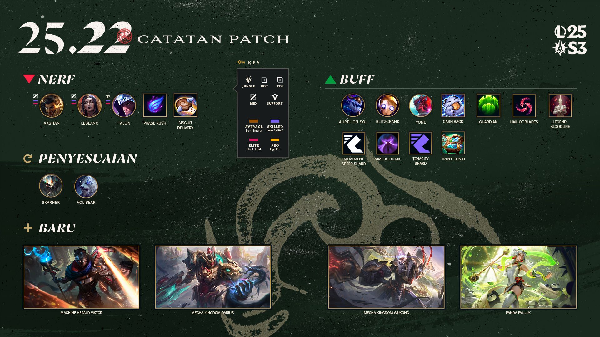 Patch penyeimbangan kali ini banyak berfokus pada Rune, dengan memberikan nerf pada beberapa Rune yang terlalu sering digunakan dan buff besar untuk Rune yang kurang diminati. Coba lihat opsi yang baru diperkuat. Siapa tahu ada sesuatu yang cocok untuk champion favoritmu!
