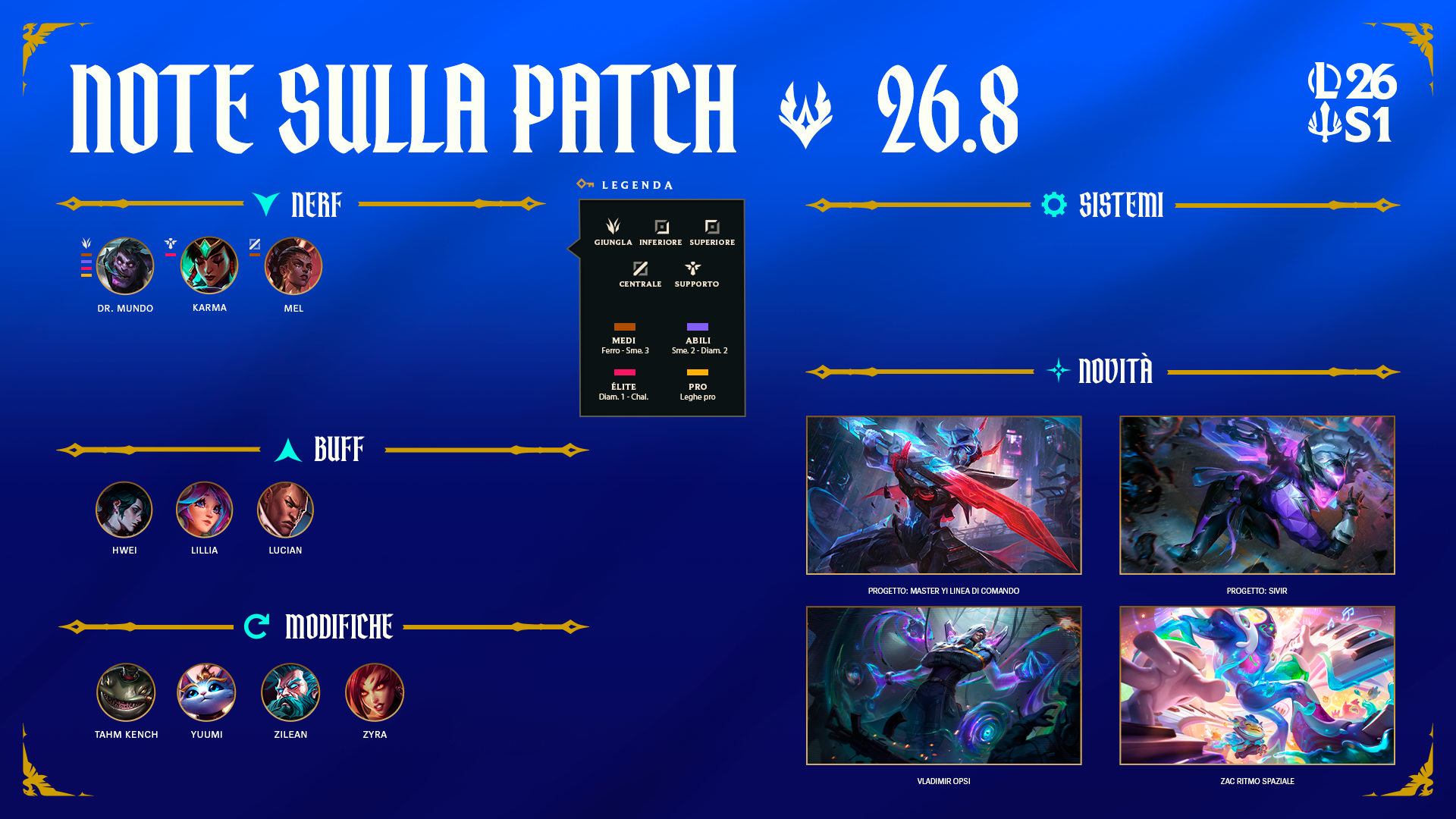 In questa patch della settimana abbiamo apportato alcune modifiche ai campioni più forti del momento come Mel e Dr. Mundo, mentre diamo una mano anche a chi sta faticando, come Lucian e Hwei. Abbiamo anche apportato alcune modifiche per aiutare a evitare che i giocatori scelgano abilità inutilizzabili al livello 1 come Zyra e Zilean.