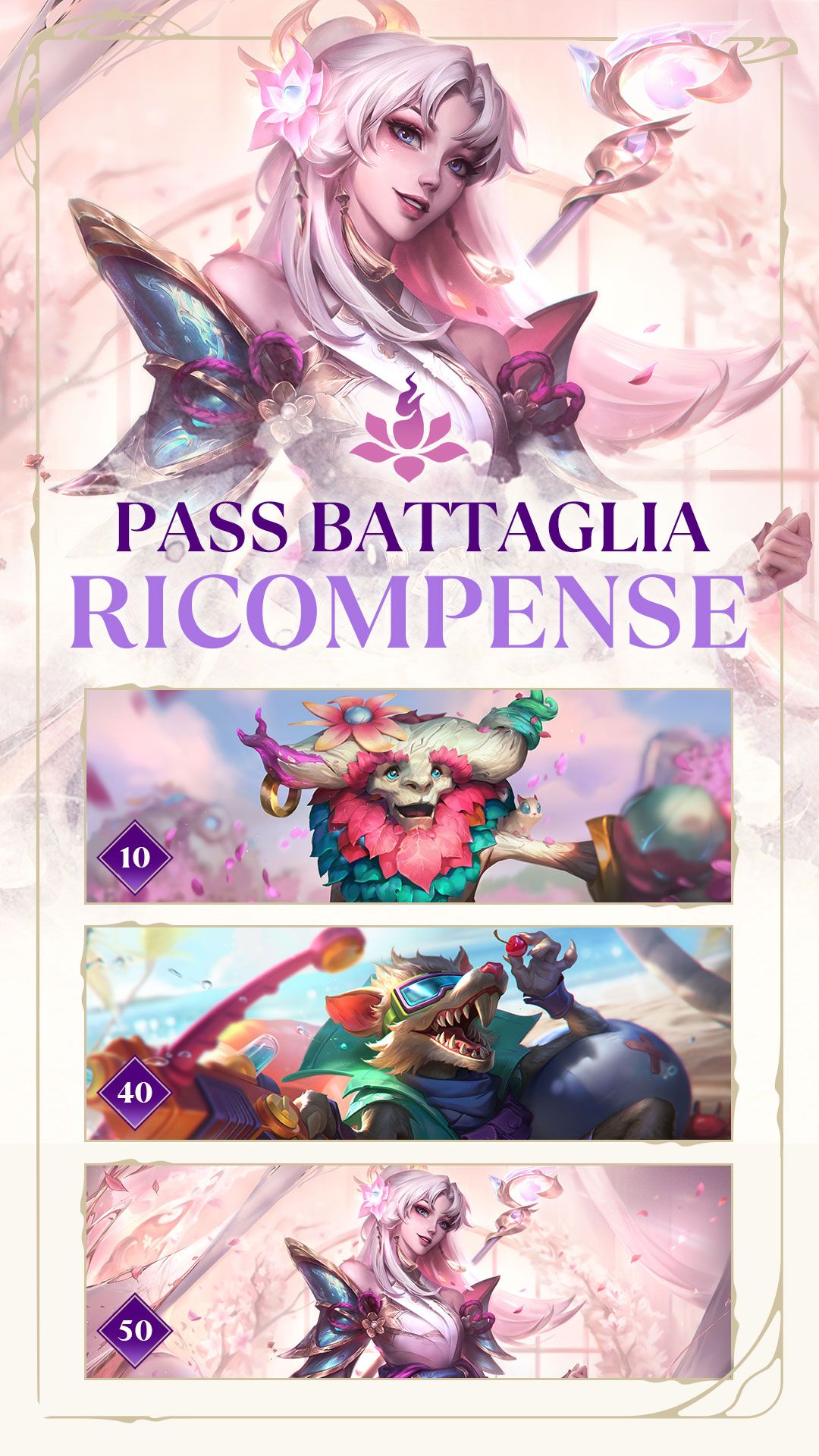 Oltre all'aggiornamento Fiore spirituale, abbiamo anche un nuovissimo Pass Battaglia stagionale. Scopritelo per ottenere bottino come Ivern Fiore spirituale, Twitch Festa in Piscina, Lux Fiore spirituale (edizione prestigio), icone e altro ancora! Consultate l'elenco qui sotto: