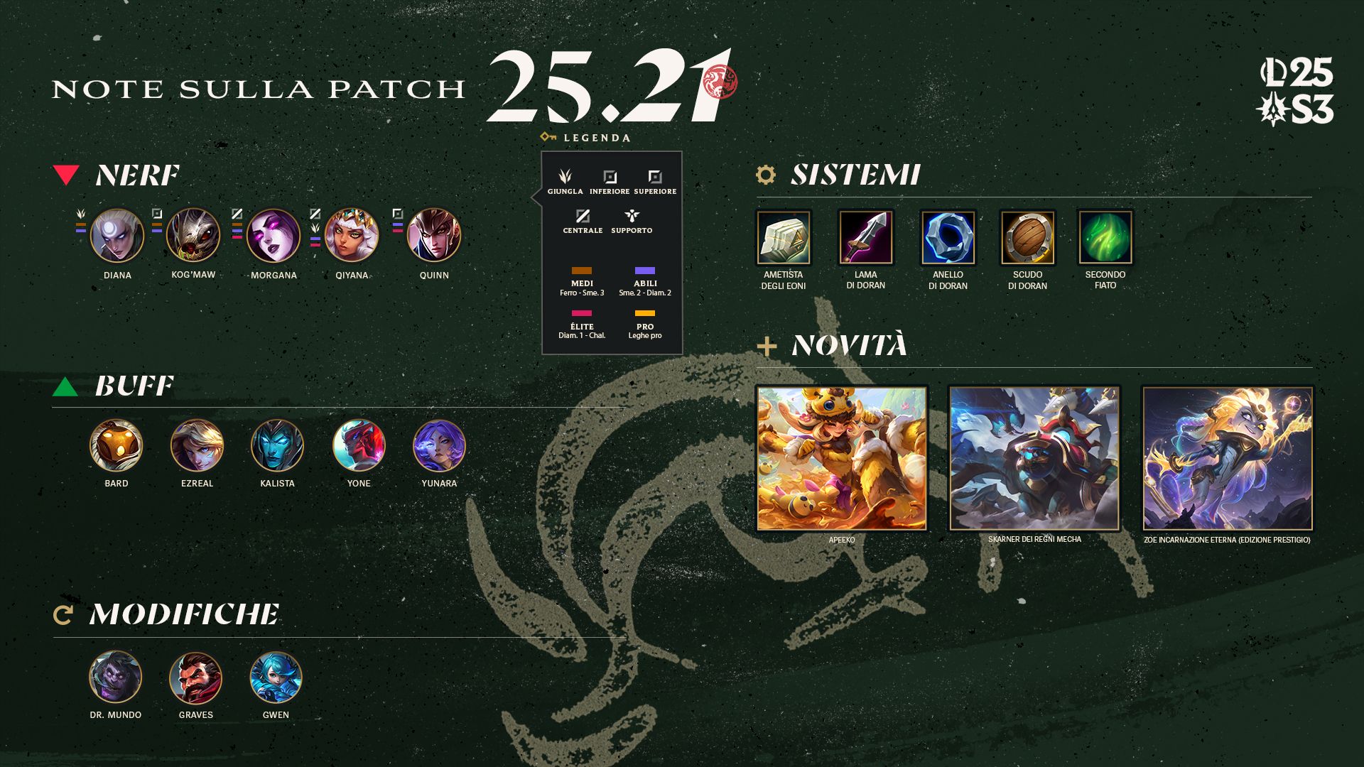 All'inizio dell'anno (Patch 25.02, all'epoca nota come 25.S1.2) abbiamo cambiato i requisiti minimi di sistema dopo aver aggiornato LoL, richiedendo l'utilizzo delle DirectX 11 di livello 11_0 agli utenti Windows e di Metal agli utenti Mac. Con la 25.21 le modifiche entreranno in vigore e per continuare a giocare a LoL sarà necessario disporre di queste tecnologie grafiche. Se rispettate già i requisiti minimi per giocare a LoL, con l'arrivo della 25.21 non avrete problemi e non noterete alcuna differenza. In caso contrario, il pulsante Gioca non sarà selezionabile e in una finestra pop-up vi verrà chiesto di aggiornare l'hardware per tornare a giocare a LoL.