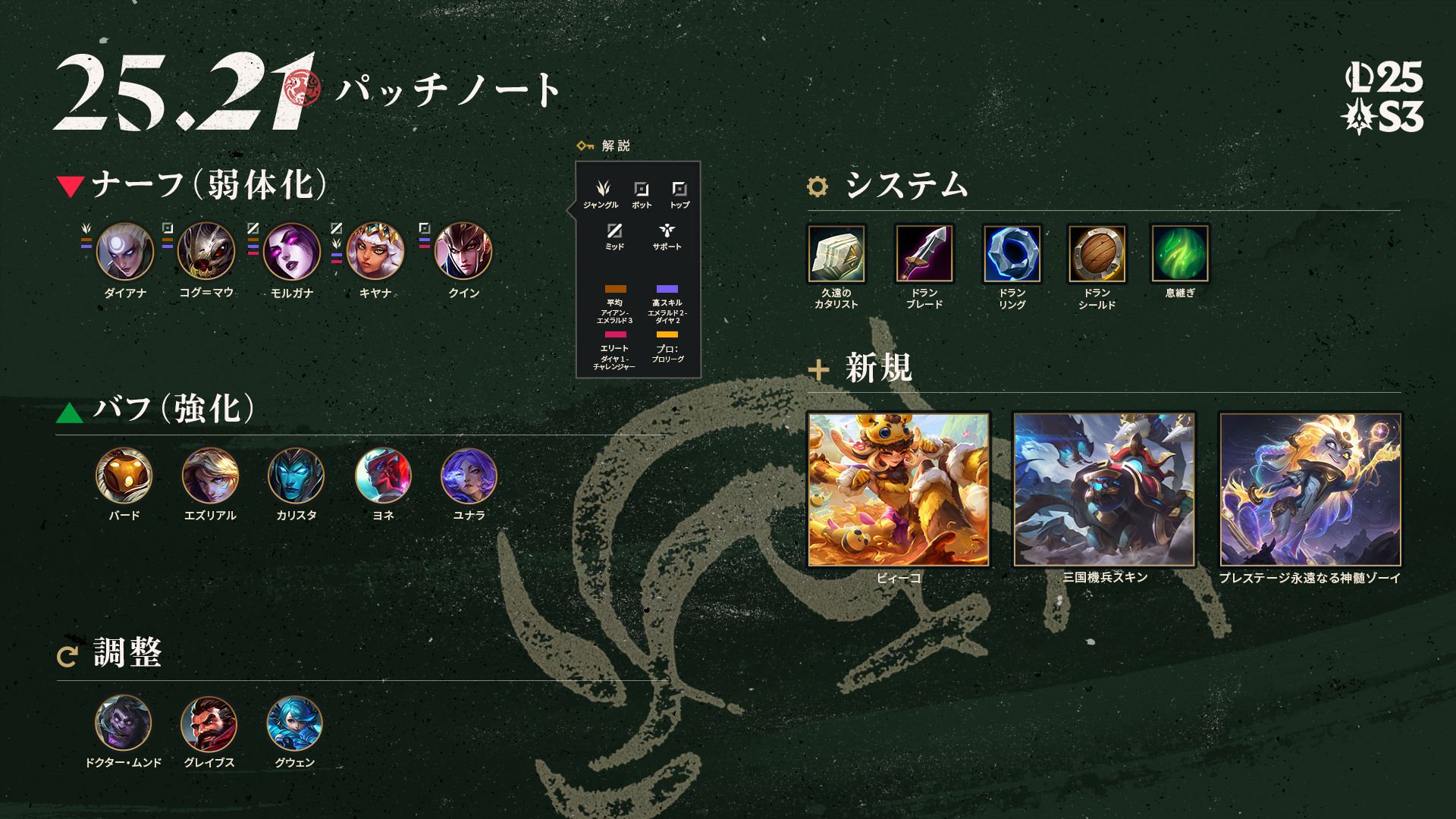 パッチ25.21では、今年最後のシーズンパスが登場します!パスを完了して、ビィーコ、三国機兵スカーナー、プレステージ永遠なる神髄ゾーイ、エモート、アイコンなどの豪華報酬を余さずゲットしましょう!