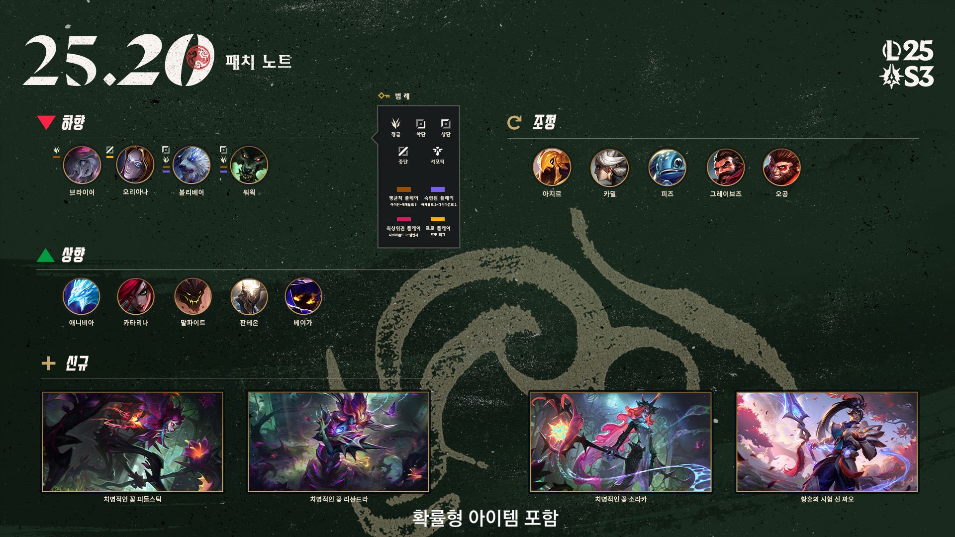 2025 리그 오브 레전드 월드 챔피언십 공식 패치에 오신 것을 환영합니다! 지난 패치에서 프로 경기 중심 변경 사항 대부분을 적용한 만큼, 이번 패치에서는 변경 사항이 프로 선수와 일반 플레이어 모두에게 잘 어울리도록 심혈을 기울였습니다. 그 결과, 숙련된 플레이어를 기준으로 다른 챔피언에 비해 성능이 떨어지는 챔피언이 일부 상향되고, 낮은 실력대 게임에서 장기간 지나치게 좋은 성과를 보여온 챔피언이 다소 하향되며, 일반 및 랭크 게임의 전반적인 승률에는 영향을 주지 않으면서 프로 경기 위력만 상향 또는 하향되도록 다수의 챔피언이 조정됩니다.