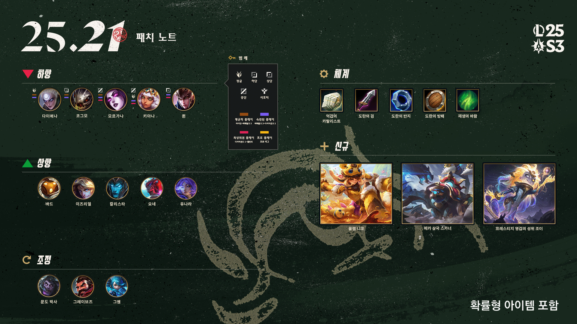 25.21 패치를 맞이할 시간입니다! 스위스 스테이지 승부의 신 예측이 잘 맞고 있나요? 아니라면 수정 구슬 예측이 구명줄이 되길 바라겠습니다.전략적 팀 전투 패치 노트는 여기에서 확인해 주세요!