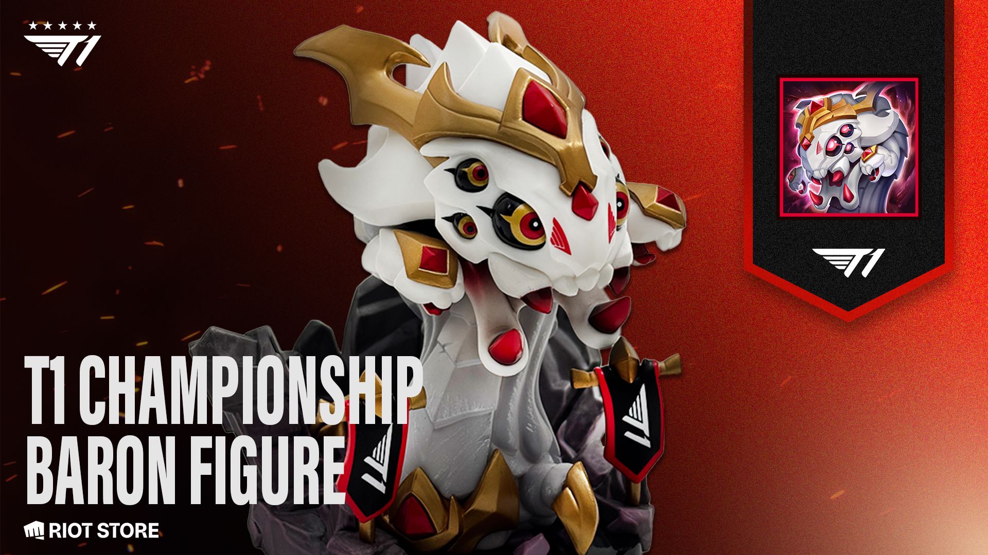 T1의 상징적인 레드&블랙 컬러로 새롭게 디자인된 리그 오브 레전드 최강의 몬스터, 바론 내셔가 팀의 다섯 번째 월드 챔피언십 우승을 기념하며 등장했습니다.(상세보기)