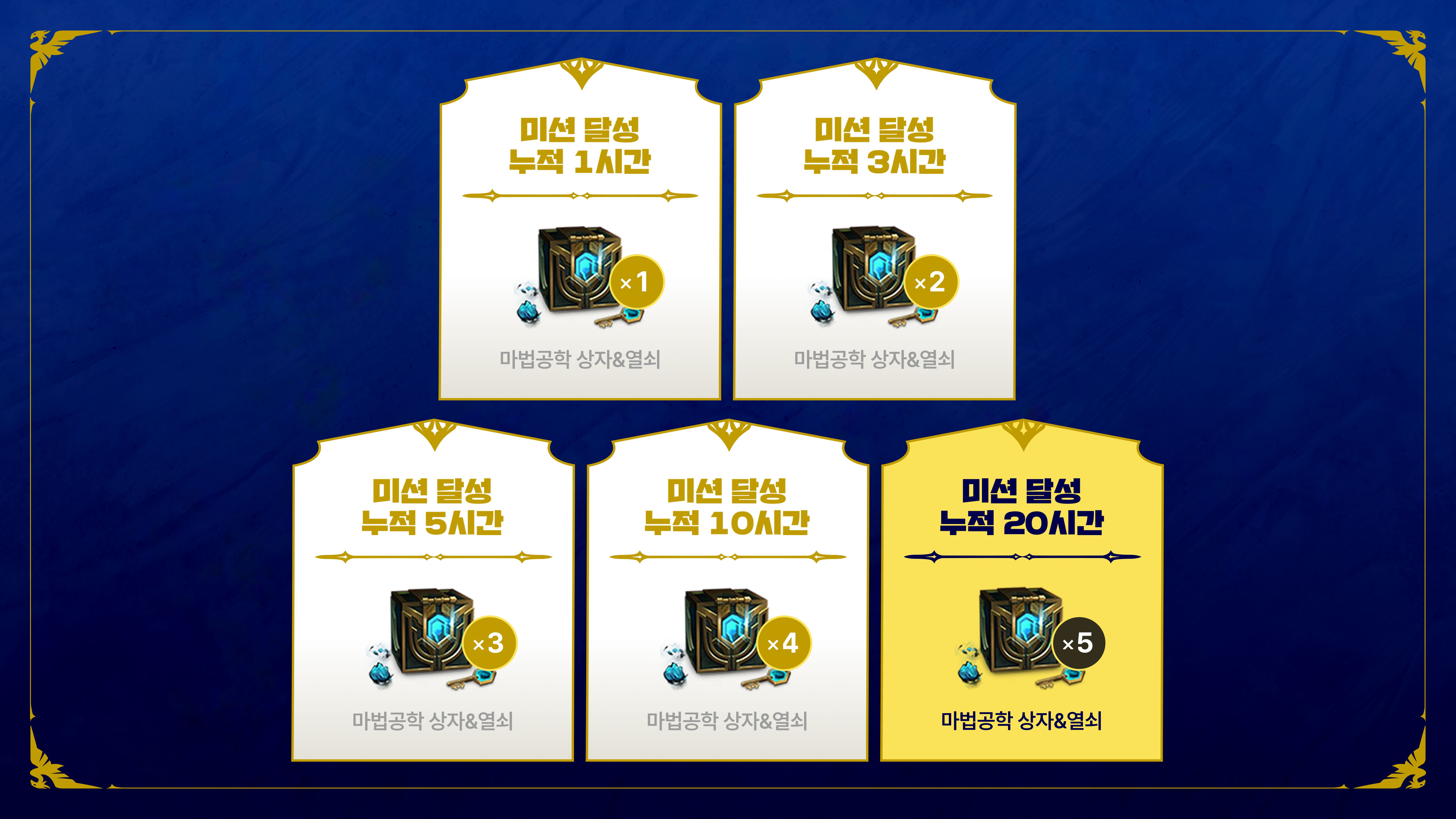 PC방에서 PvP 게임 모드와 AI 상대 대전을 즐기며 누적 플레이 시간을 채우고 보상을 받아보세요! 플레이 시간이 일정 구간에 도달할 때마다, 정해진 수량의 ‘마법공학 상자 & 열쇠’ 세트를 받을 수 있습니다. 최대 15개까지 획득할 수 있습니다.
