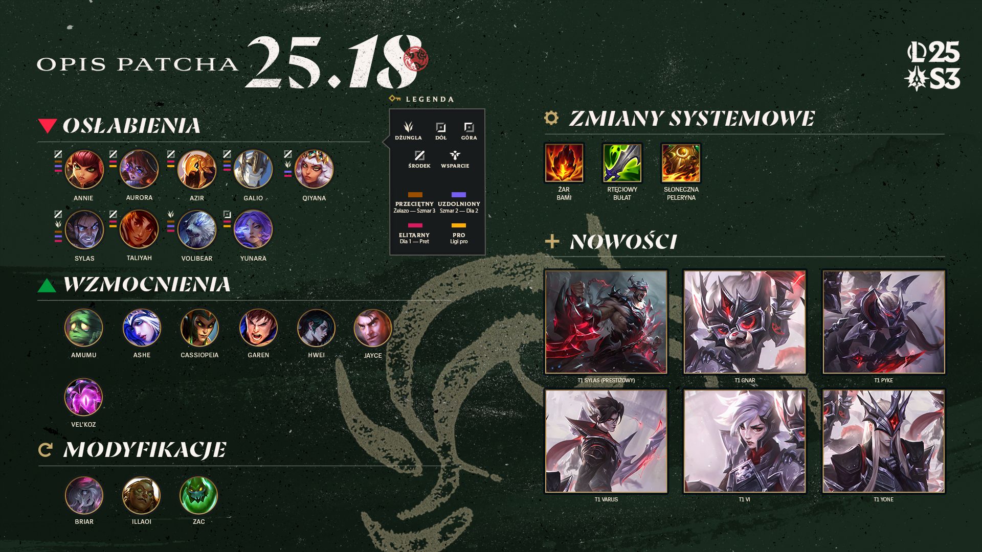W tym patchu nie modyfikujemy ról bohaterów. Wprowadzamy usprawnienia oparte o poprzednie zmiany. Z najważniejszych mamy wzmocnienie Żaru Bami dla dżunglerów, usprawnienia Illaoi, pierwsze spore osłabienie Yunary i Qiyany oraz Sylasa w dżungli.