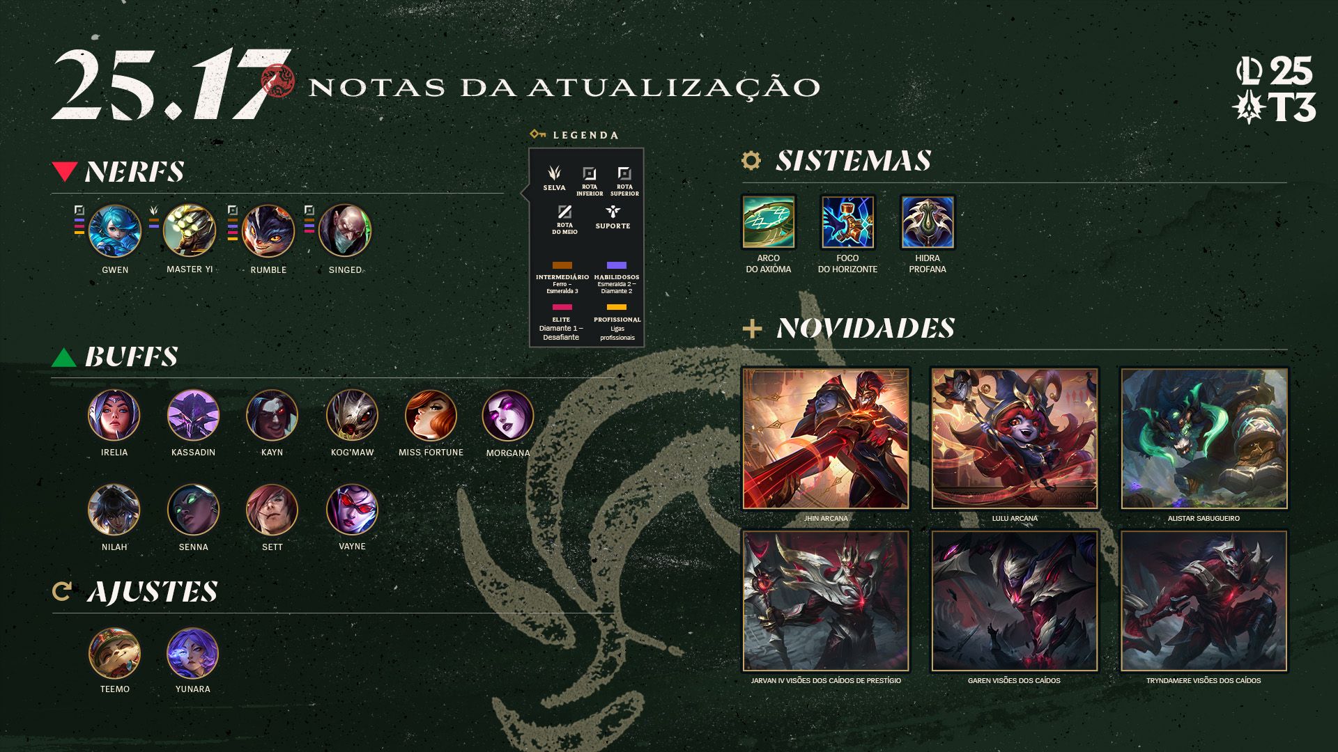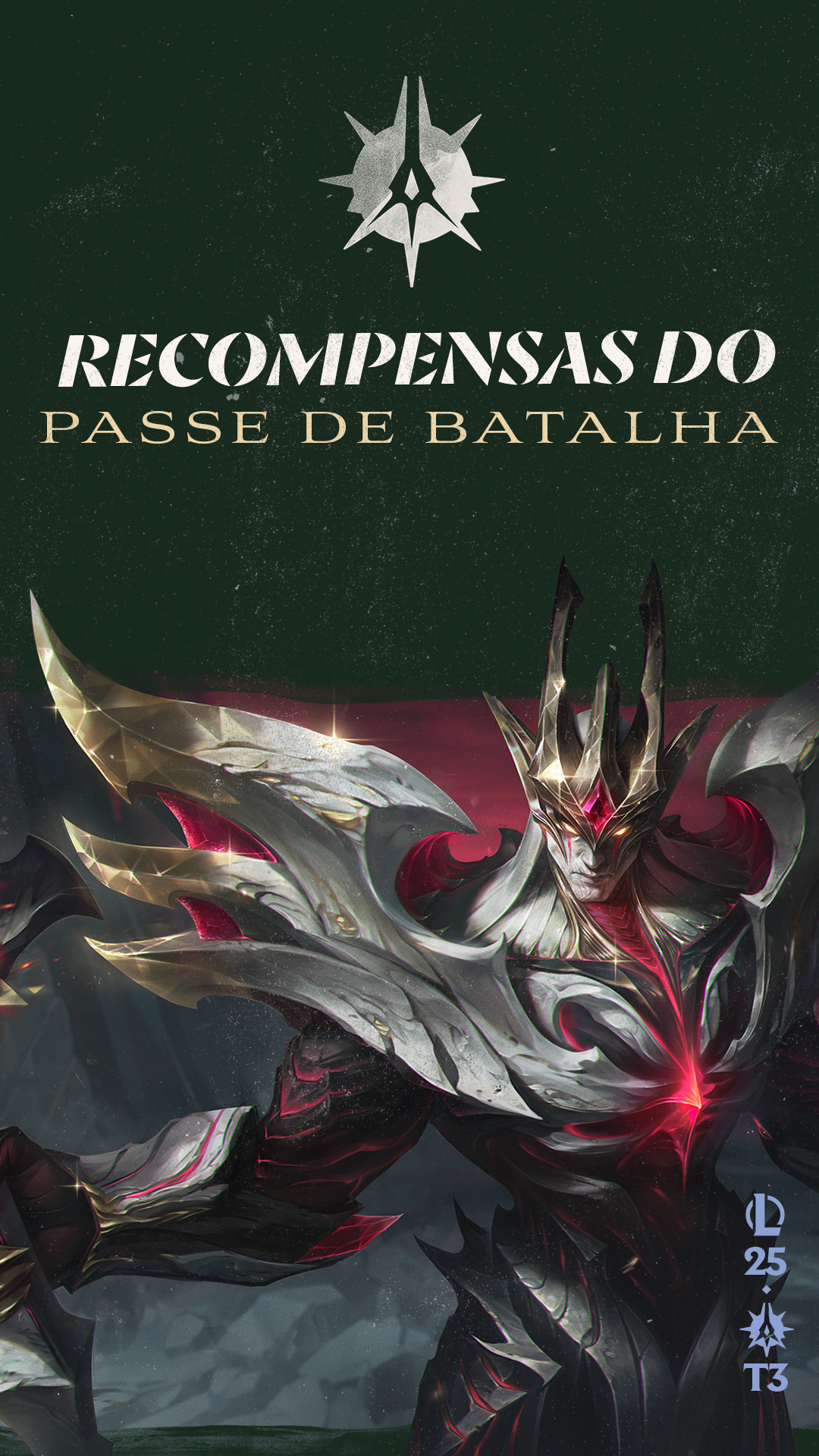 Juntamente com esta atualização, temos um novo Passe de Batalha sazonal! Confira as novidades, como Lulu Arcana, Jhin Arcana, Jarvan IV Visões dos Caídos de Prestígio, emotes, ícones e mais! Esse também será o primeiro passe com 48 níveis em vez de 50. A EXP necessária por nível permanece inalterada, então completá-lo será mais rápido do que antes.