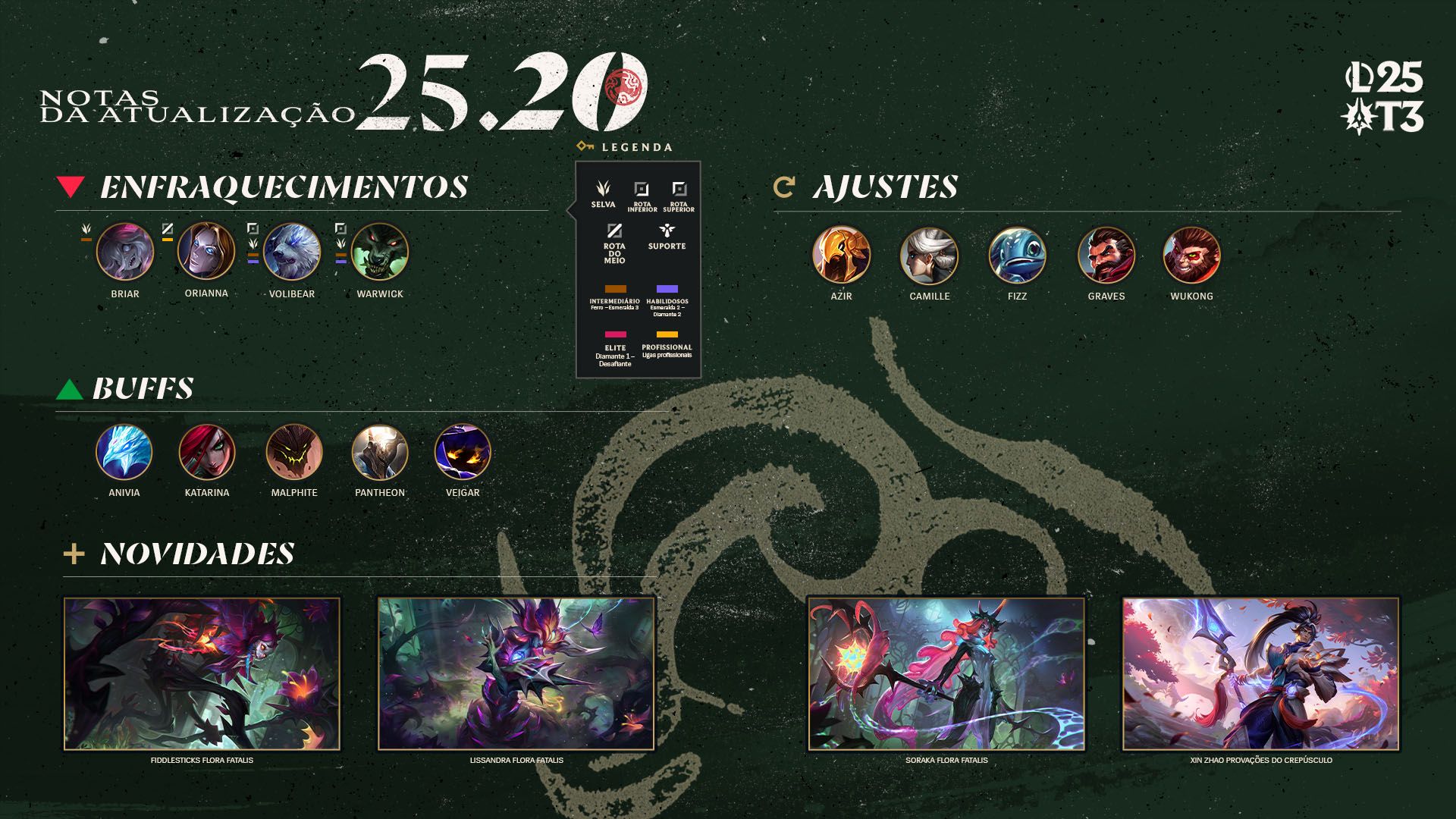 Semana cheia de novidades! Estamos trazendo: novas skins Flora Fatalis (e aquele Fiddlesticks SINISTRO), última rodada de Bots da Condenação com todos as três Provações disponíveis (boa sorte, hein!), ajustes pro Arena, melhorias no Modo Streamer, teste na proibição de banimento do Campeão de aliado (algumas regiões), busca de emotes e, claro, os balanceamentos de sempre. Confira todos os detalhes!