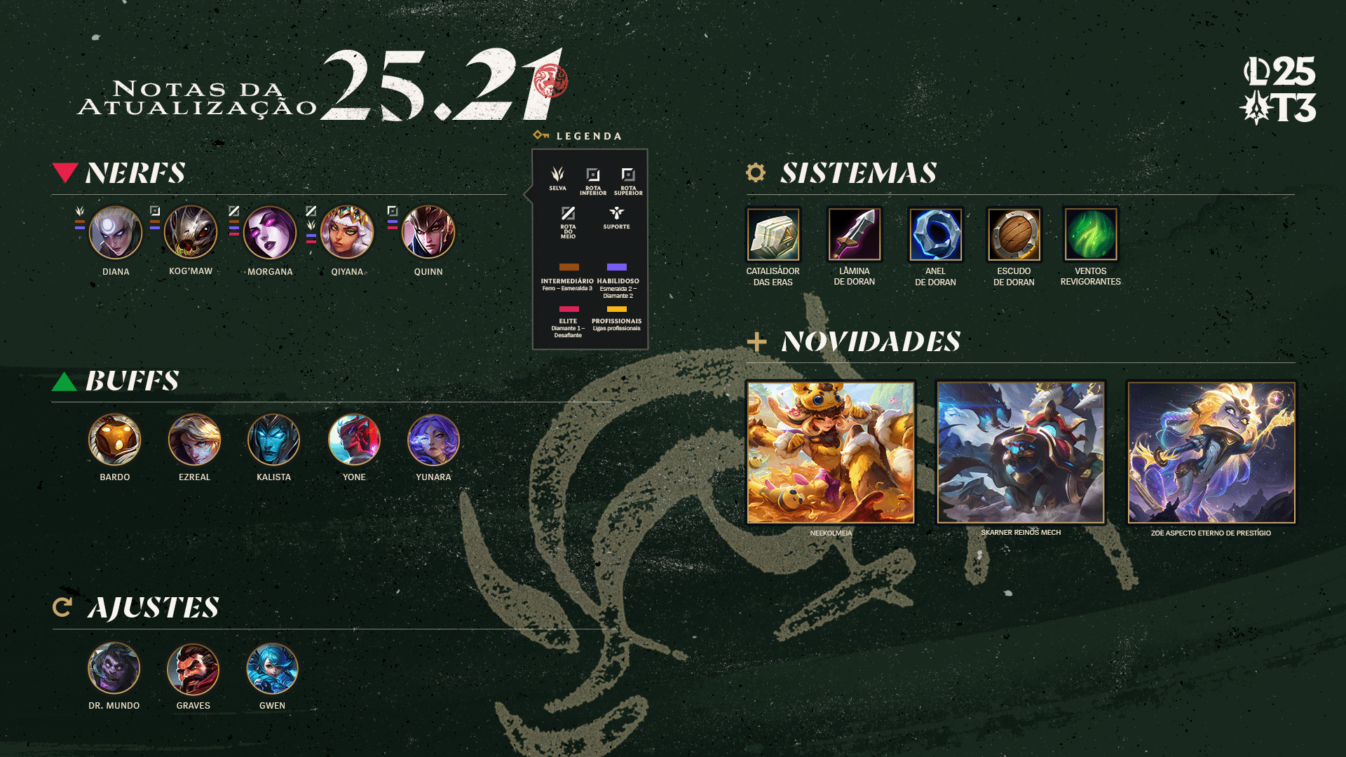Com a chegada da 25.21, também teremos nosso último passe sazonal do ano! Basta concluí-lo para garantir as skins Neekolmeia, Skarner Reinos Mech e Zoe Aspecto Eterno de Prestígio, além de todos os emotes, ícones e muito mais para quem adquirir o passe.