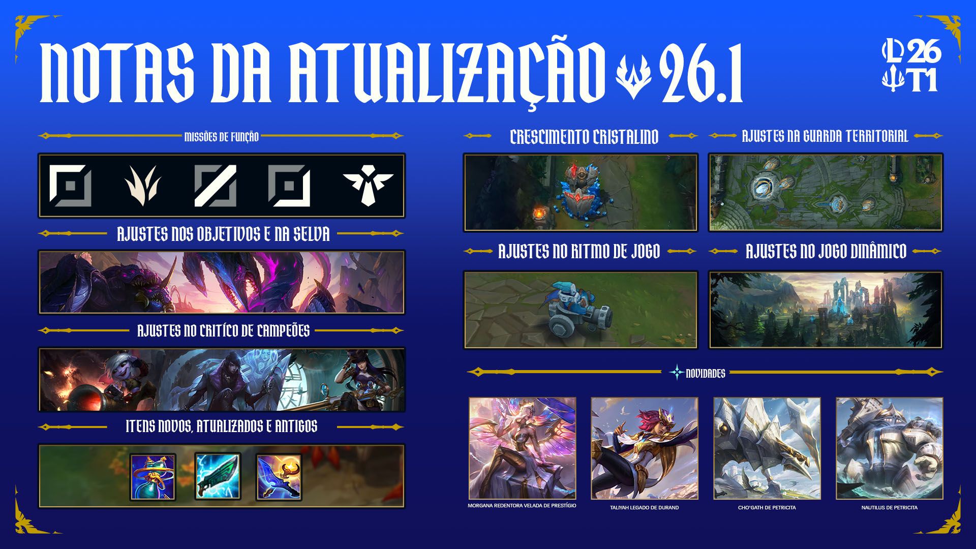Boas-vindas à nova temporada do League of Legends! Temos uma ampla gama de mudanças nesta atualização, então quem não quiser ler milhares e milhares de palavras, aqui vai um resumo: a mecânica de jogo estratégica focará mais em torres e menos em monstros épicos, com ajustes e o novo Crescimento Cristalino. A força das funções foi rebalanceada com Missões de Função para cada uma. Lumes Feéricos trazem novas mecânicas de visão. Novos itens para cada classe estão esperando por um novo lar no seu inventário! Além disso, o Dano Crítico base de quase todos os Campeões agora é 200%. As ranqueadas também estão passando por mudanças para reduzir a frustração envolvendo o preenchimento automático. As partidas ficarão um pouco mais rápidas, tanto no SR tradicional quanto no Jogo Dinâmico. Quem quiser saber mais sobre alguma dessas mudanças, basta conferir o Blog do Desenvolvedor aqui ou continuar lendo!